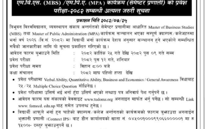 काठमाडौँ । त्रिभुवन विश्वविद्यालय, व्यवस्थापन संकायले एमबीएस (Master of Business Studies) र एमपीए (Master of Public Administration) कार्यक्रमका लागि प्रवेश परीक्षा २०८२ पुस १२ गते हुने जनाएको छ । स्नातक तह उत्तीर्ण विद्यार्थीका लागि सेमेस्टर प्रणालीमा...