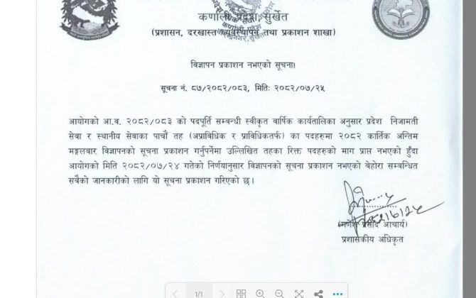 काठमाडौँ । कर्णाली प्रदेश लोक सेवा आयोगले यस आर्थिक वर्षको विज्ञापन प्रकाशन हालका लागि स्थगित गरेको छ । आयोगले २०८२/०८३ को स्वीकृत वार्षिक कार्यतालिकाअनुसार निजामती सेवा र स्थानीय सेवाका पदहरू (अप्राविधिक र प्राविधिक) का लागि २०८२...