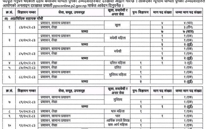 काठमाडोँ । प्रदेश सरकारको प्रदेश निजामती सेवा आयोगले सहायक पाँचौँ तह (अप्राविधिक/प्राविधिक) पदमा खुला, समावेशी तथा अन्तर सेवा प्रतियोगितात्मक लिखित परीक्षाका लागि नयाँ विज्ञापन प्रकाशित गरेको छ । विज्ञापन नं. ६६/०८०–८१ अनुसार प्रशासन तथा लेखाबाट...