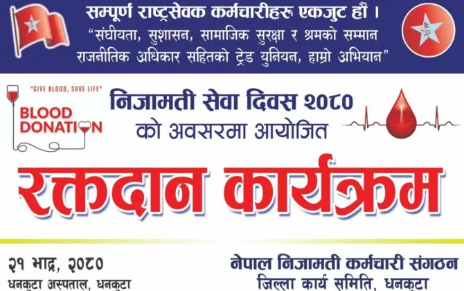 नेपाल निजामती कर्मचारी संगठन जिल्ला कार्यसमिती धनकुटाले रक्तदान कार्यक्रम आयोजना गरेको छ । निजामती सेवा दिवस २०८० को अवसरमा जिल्ला कार्य समिती धनकुटाले रक्तदान कार्यक्रम आयोजना गरेको हो । कर्मचारीहरुको पेशागत हक हितका लागि...