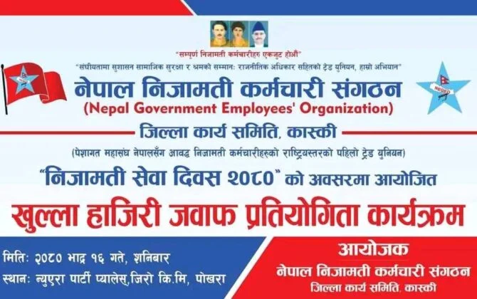 नेपाल निजामति कर्मचारी संगठन कास्कीले खुला हाजिरी जवाफ प्रतियोगिता कार्यक्रम सञ्चालन गर्ने भएको छ । निजामति सेवा दिवस २०८० को अवसर पारेर अतिरिक्त क्रियाकलाप अन्तर्गत हाजिरी जवाफ प्रतियोगिता कार्यक्रम आयोगना गरिएको नेपाल निजामति कर्मचारी...