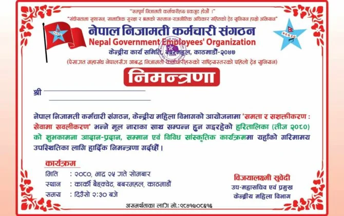 नेपाल निजामती कर्मचारी संगठन केन्द्रिय महिला विभागले हरितालिका तिजको अवसरमा सुभकामना आदान प्रदान सम्मान एवम विविध सास्कृतिक कार्यक्रम सम्पन्न गर्ने भएको छ । नेपाल निजामती कर्मचारी संगठन केन्द्रिय महिला विभागको आयोजनामा भाद्र २५ गते...