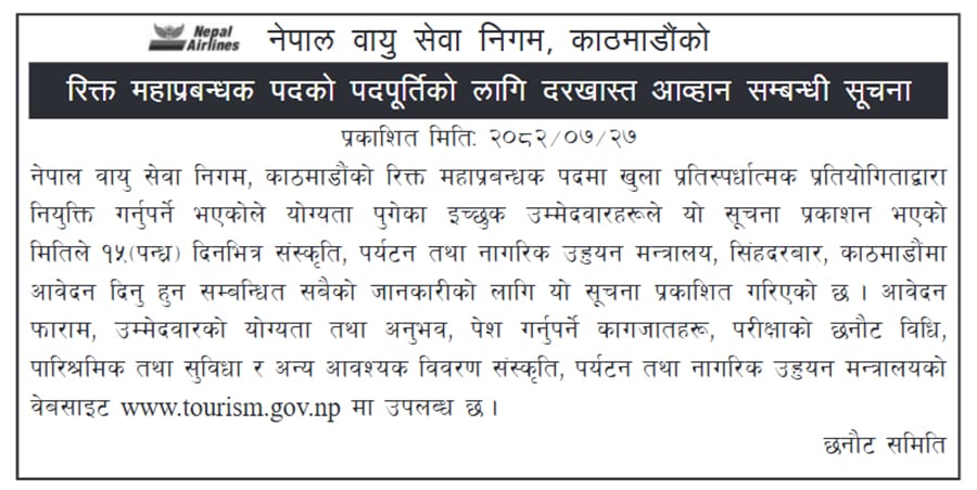 वायु सेवा निगमले बिहीबार बिहान सूचना जारी गर्दै महाप्रबन्धक खुला प्रतिस्पर्धाबाट नियुक्ति गर्न लागिएको जानकारी दिएको हो । इच्छुक तथा योग्य नेपाली नागरिकले सूचना प्रकाशित भएको मितिले १५ दिनभित्र संस्कृति, पर्यटन तथा नागरिक उड्डयन मन्त्रालयमा आवेदन दिन सक्नेछन् ।