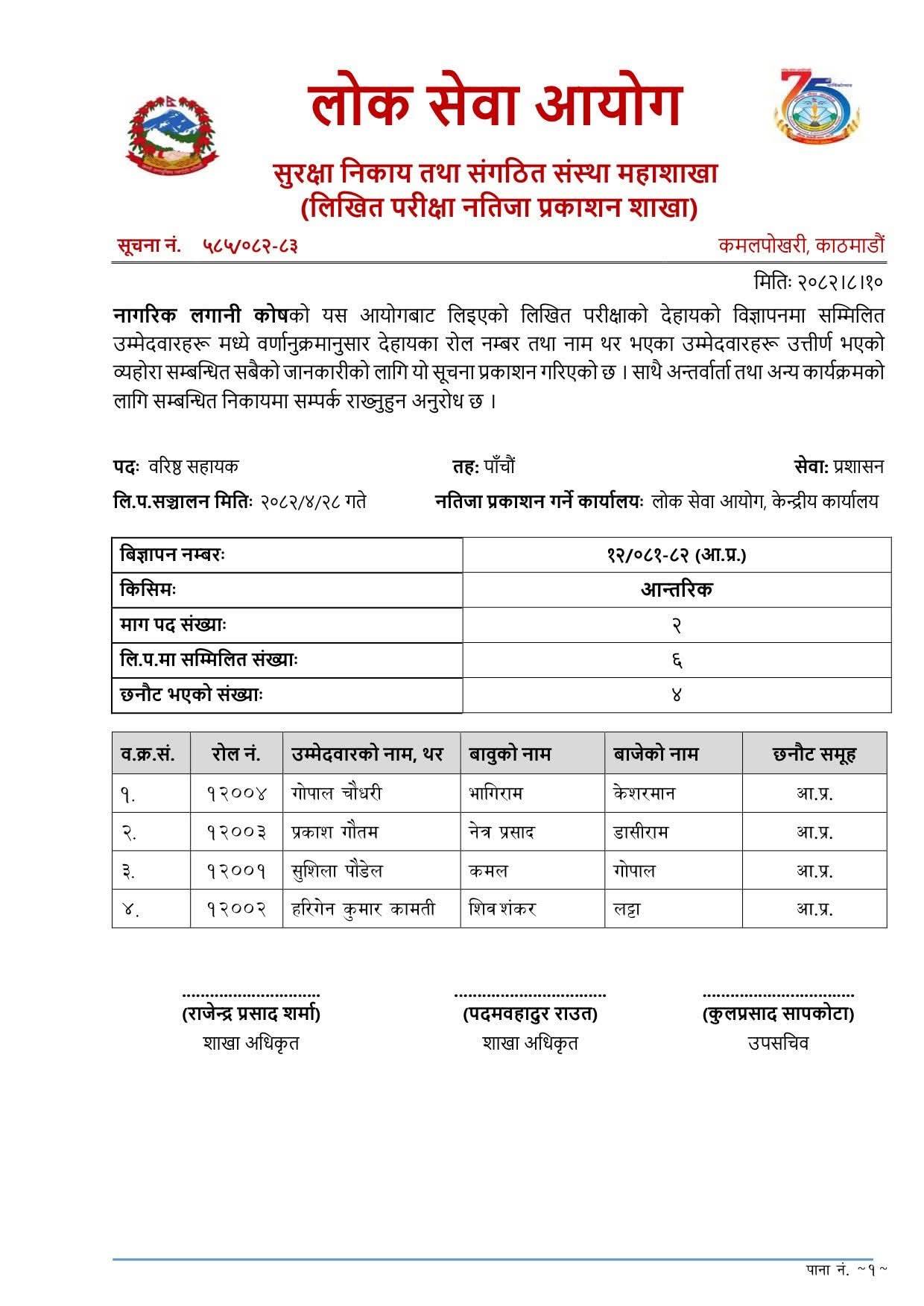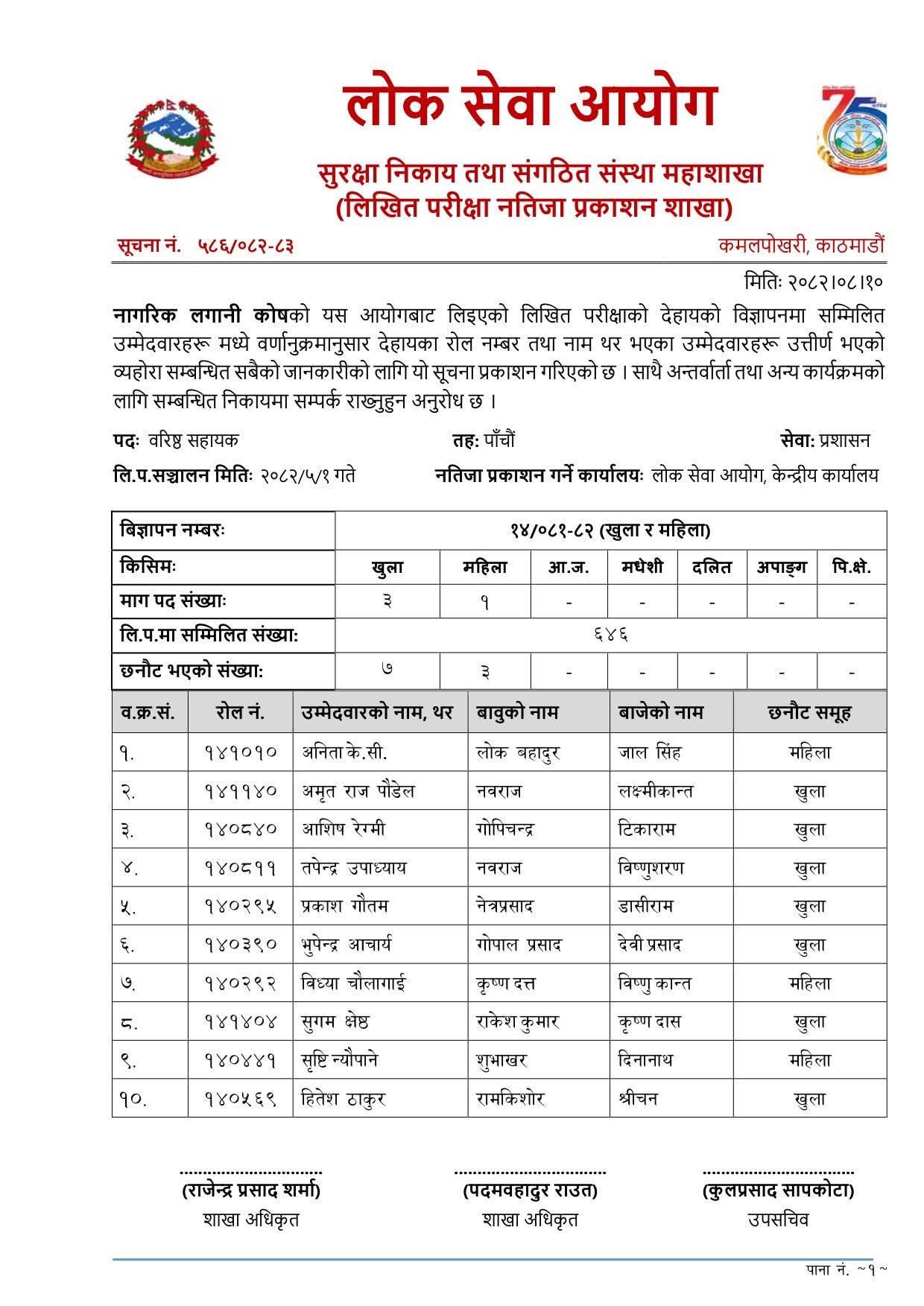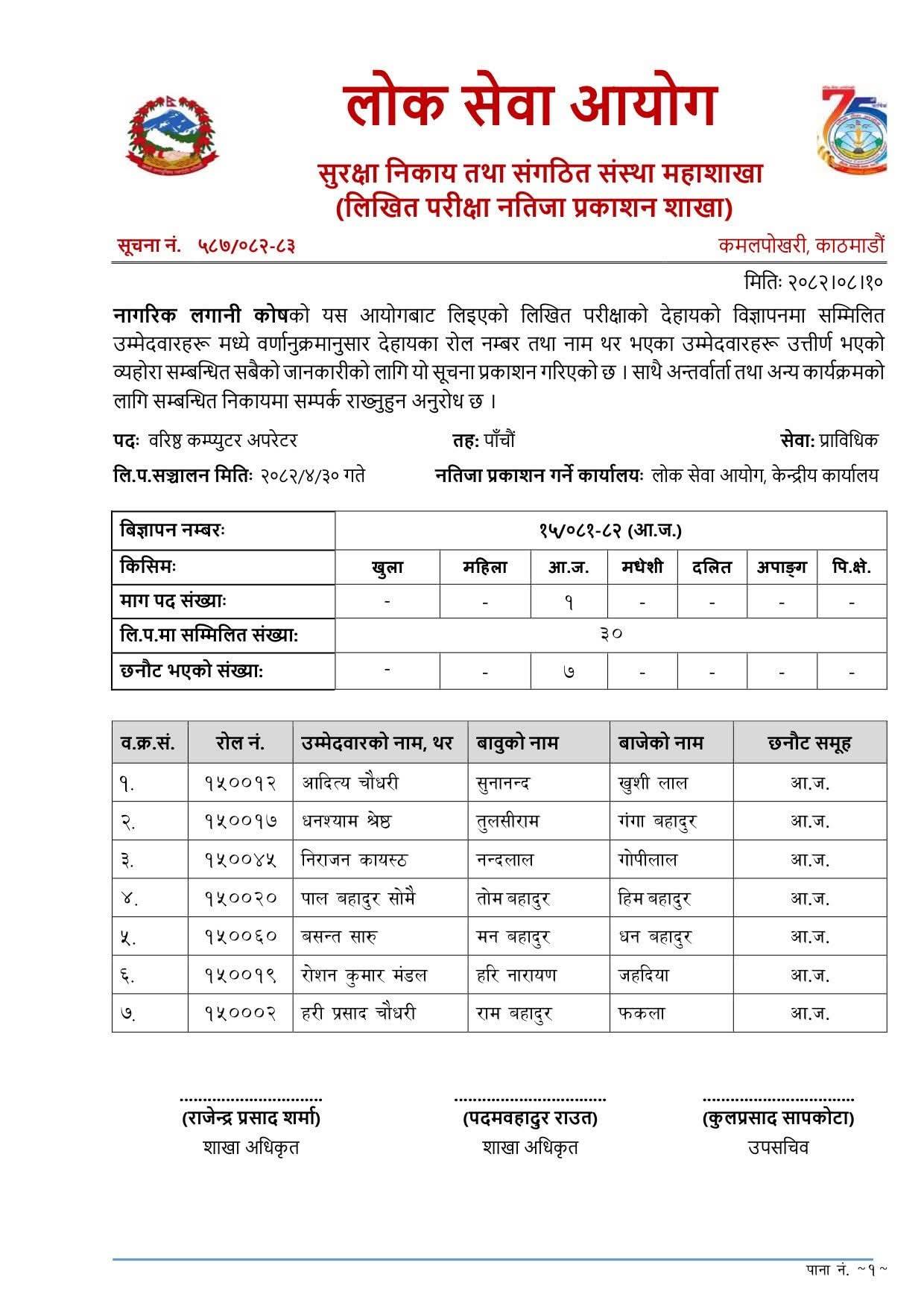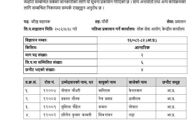 उक्त परीक्षा नतिजा वि.सं. १२, १४ र १५/०८१-८२ का लागि लागू हुने गरी प्रकाशित गरिएको हो । यसमा आन्तरिक प्रतिस्पर्धा (आ.प्र.), खुला र समावेशी विधिबाट उम्मेदवारहरूले सहभागिता जनाएका थिए ।