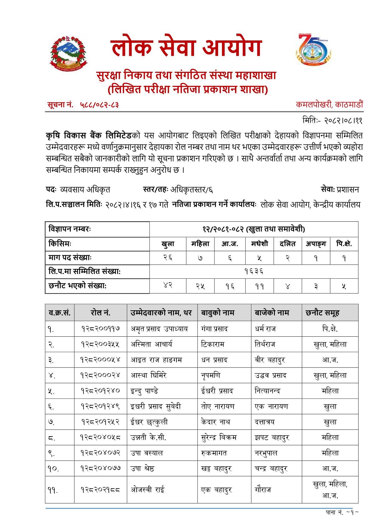 लोक सेवा आयोगले कृषि विकास बैंक लिमिटेडको लिखित परीक्षाको नतिजा सार्वजनिक गरेको छ । प्रशासन सेवा अन्तर्गत व्यवसायीक अधिकृत, अधिकृतस्तर–६ पदका लागि लिइएको परीक्षाबाट ४३ जना उम्मेदवार उत्तीर्ण भएका छन् ।