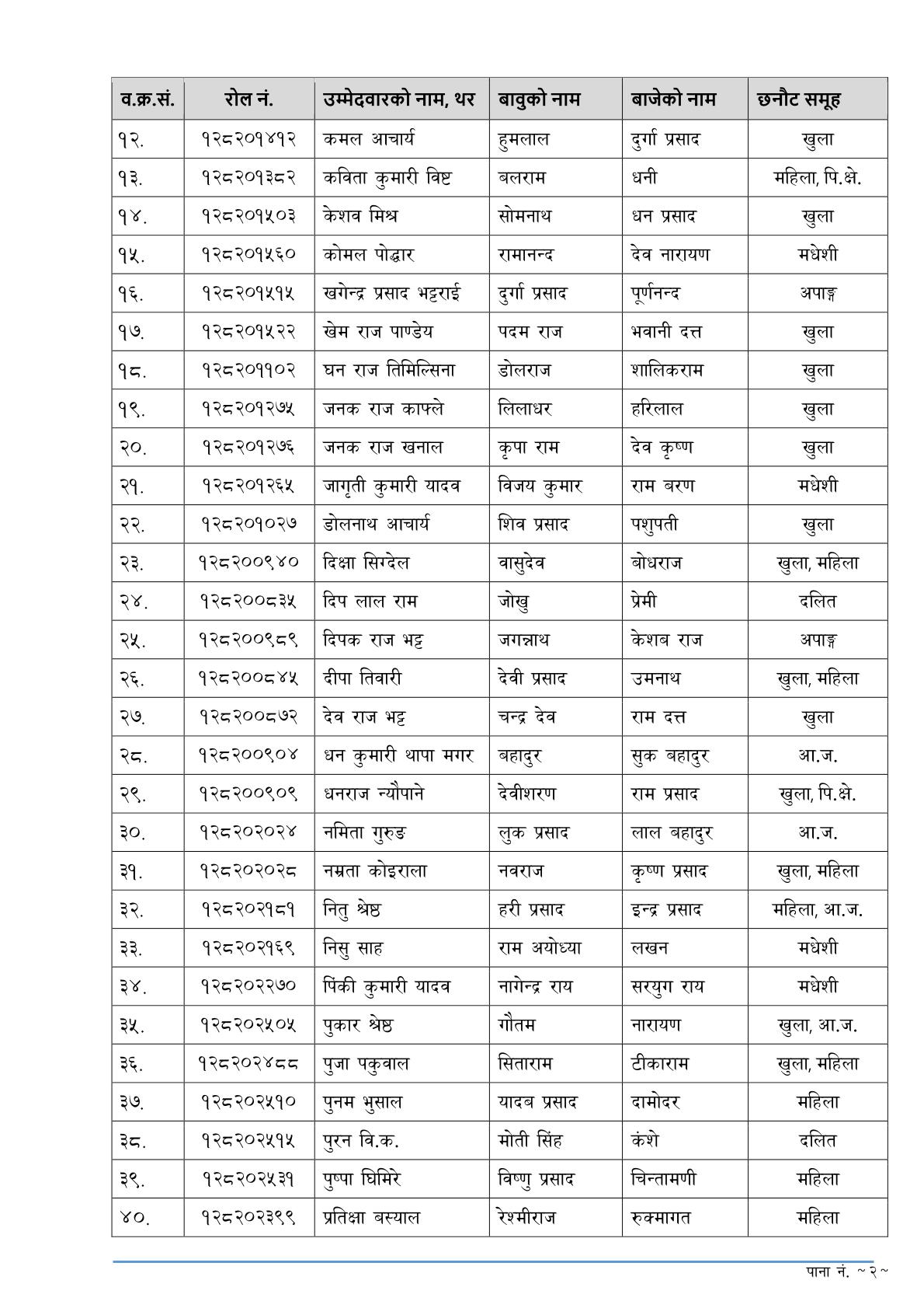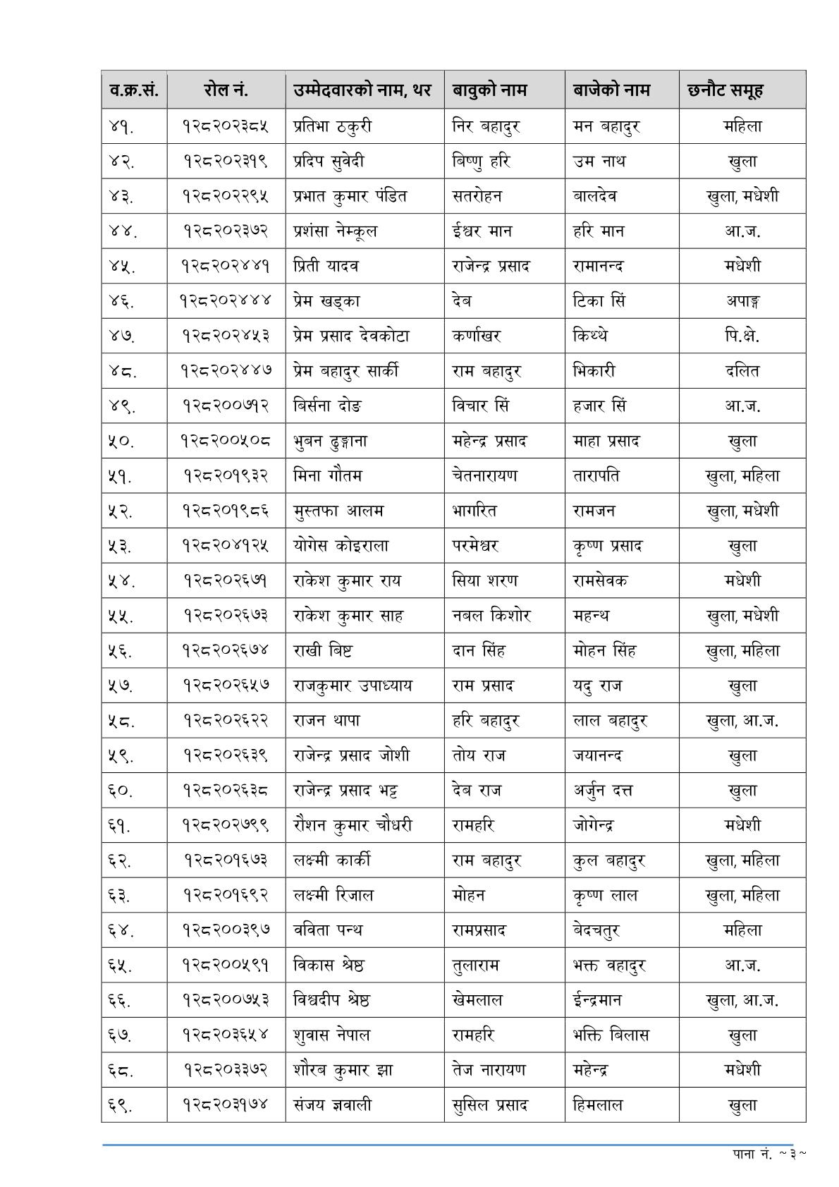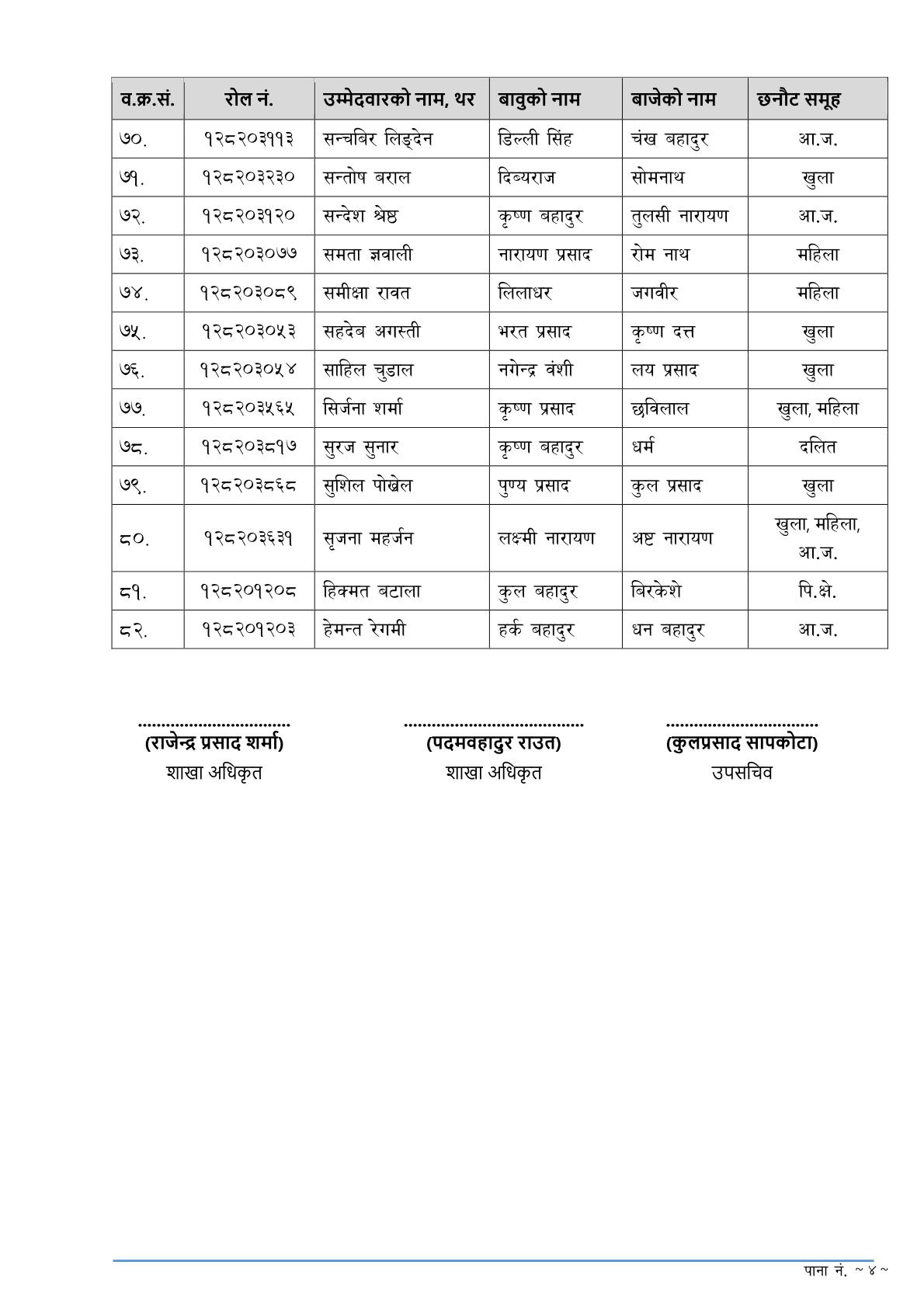 सामान्य, महिला, आदिवासी जनजाति, मधेसी, दलित, मुस्लिम तथा पिछडिएको क्षेत्रका कोटामा गरी जम्मा १३७ जना उम्मेदवार परीक्षामा सहभागी भएका थिए । आयोगले वर्णानुक्रमअनुसार रोल नम्बर, नाम तथा थर समेटेर उत्तीर्ण सूची प्रकाशित गरेको हो ।