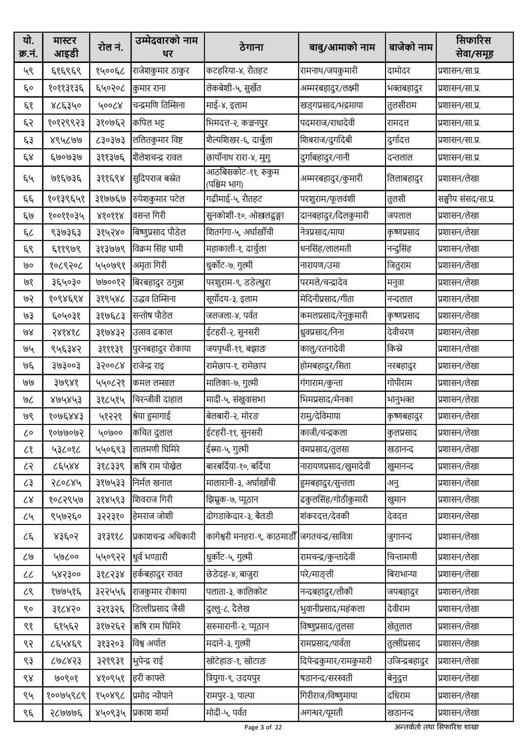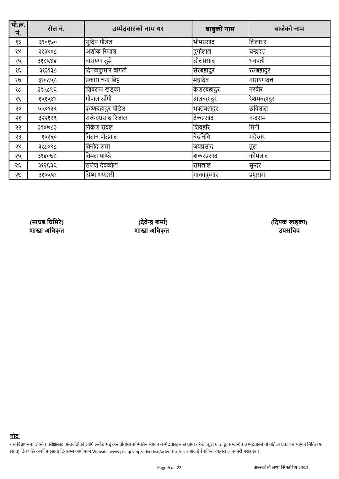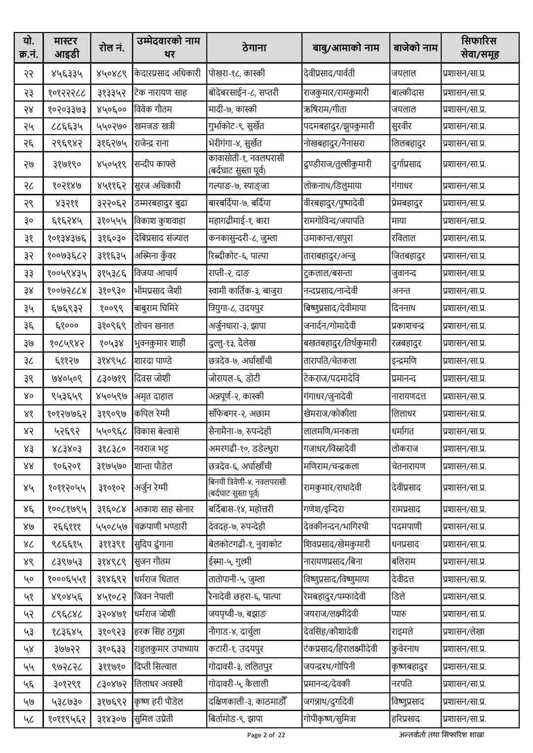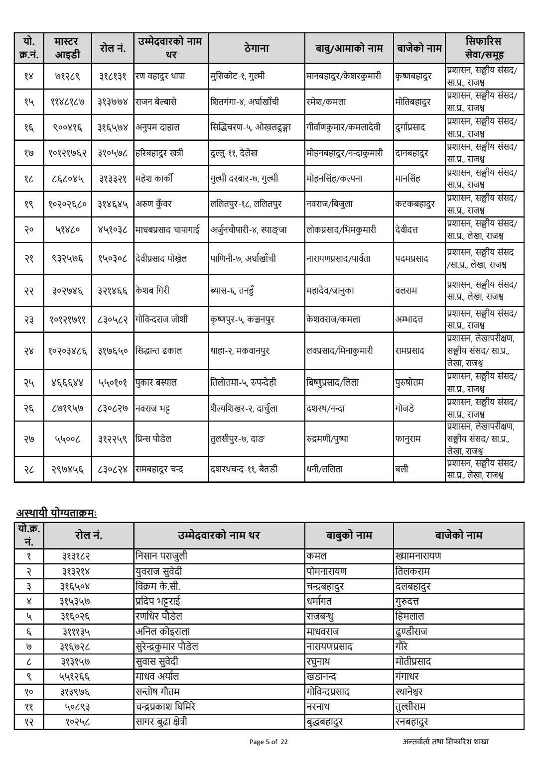 प्रकाशित सूचनामा प्रशासकीय सेवा/राजपत्रांकित तृतीय श्रेणीअन्तर्गत विभिन्न पदहरूका लागि २१ जना उम्मेदवार सिफारिस भएका छन्। सूचनामा उम्मेदवारको नाम, ठेगाना, अभिभावकको विवरण तथा सिफारिस भएको सेवा/समूह स्पष्ट उल्लेख गरिएको छ।