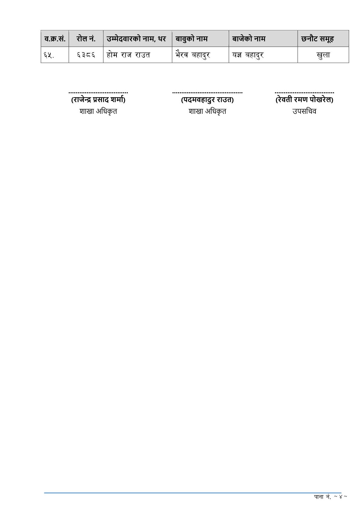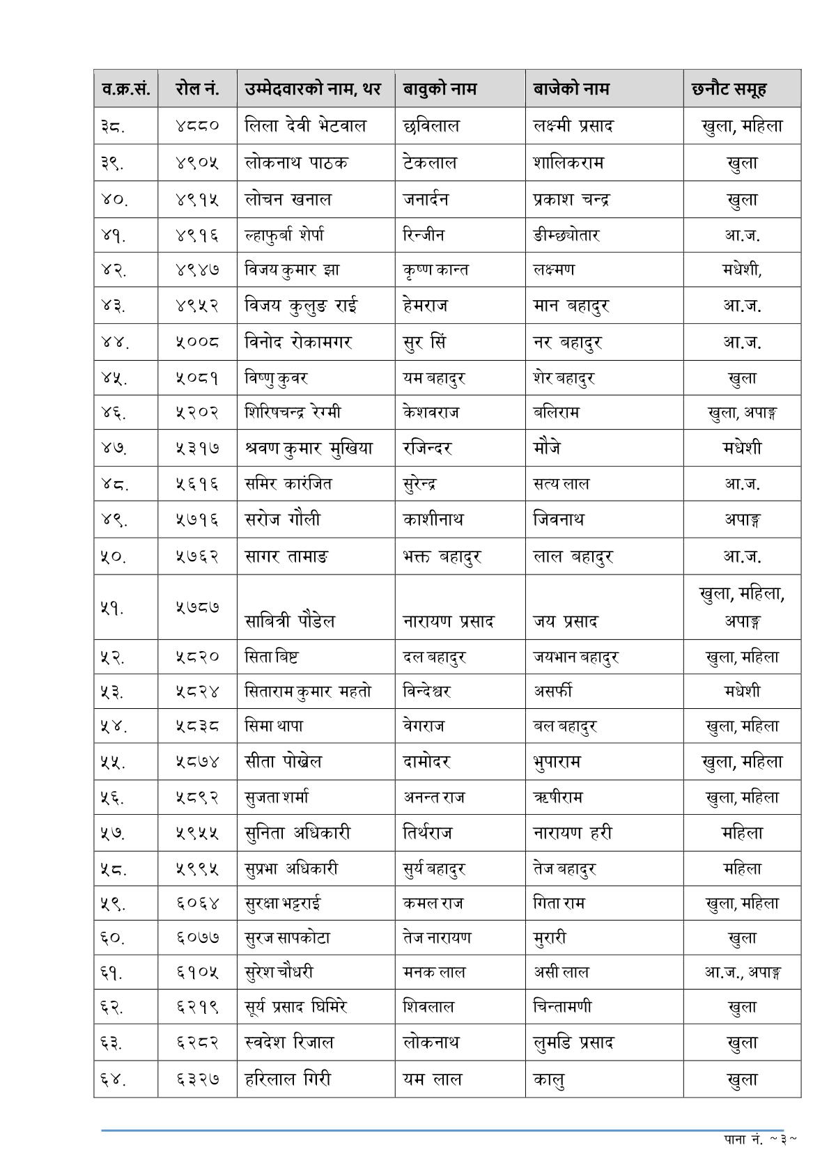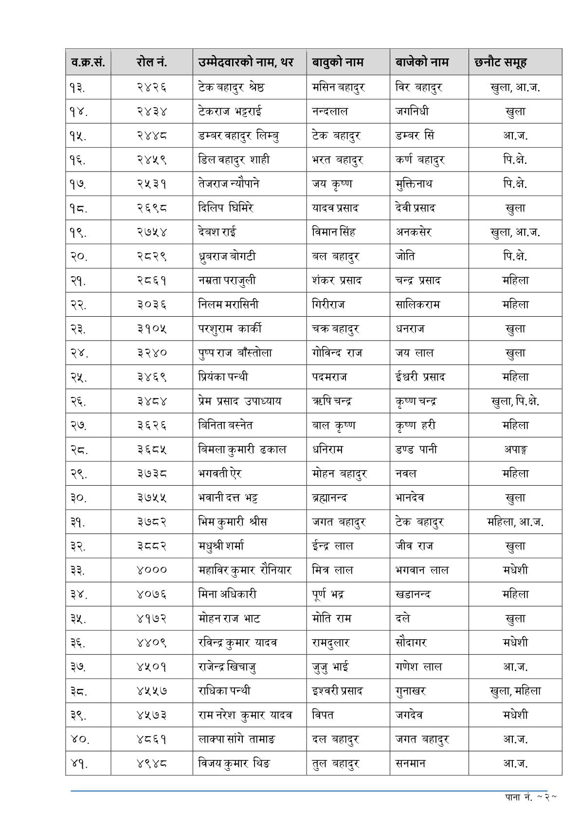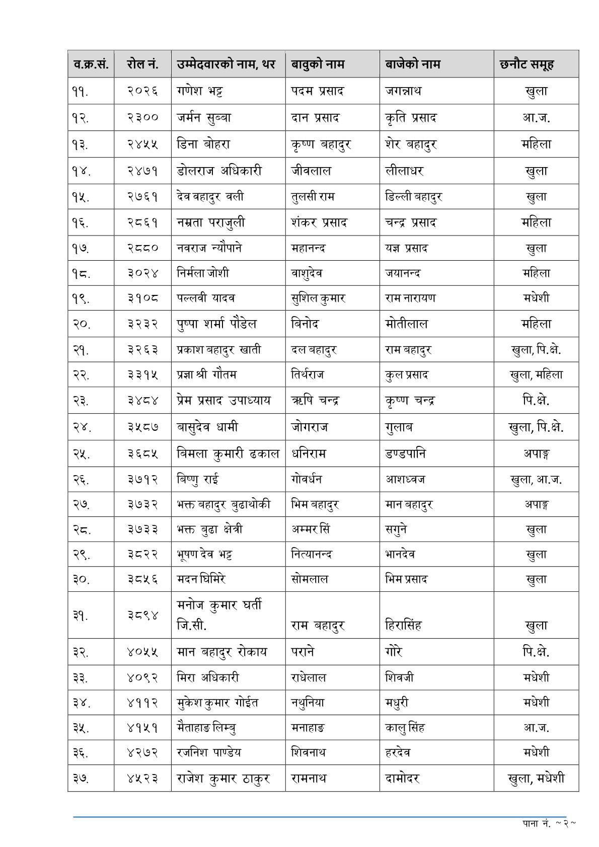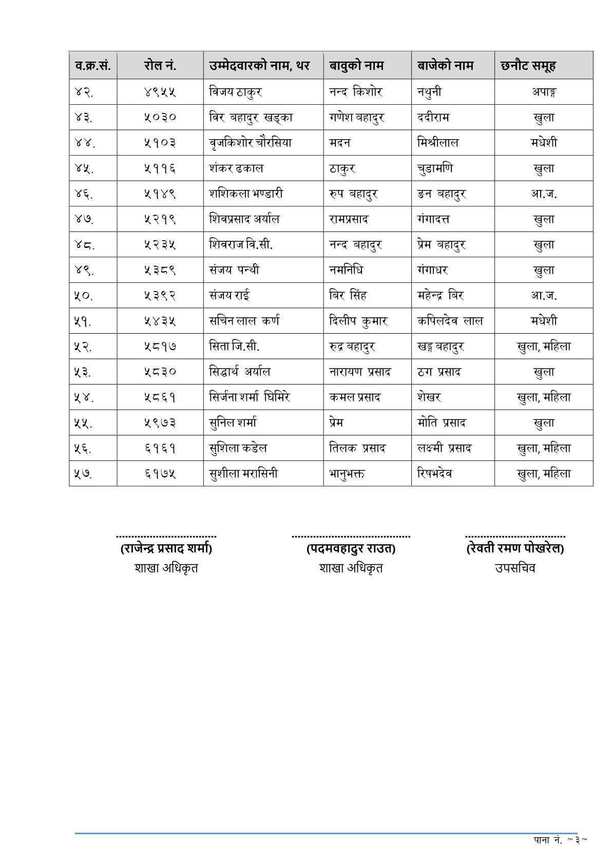 प्रकाशित नतिजामा समावेश उम्मेदवारहरूको रोल नम्बर, नाम, थर तथा कोटा समूह अनुसारको विवरण उल्लेख गरिएको छ । छनोट भएका उम्मेदवारलाई अन्तर्वार्ता तथा आवश्यक प्रक्रिया पूरा गर्न आयोगको सूचनामा उल्लेख भएअनुसार तोकिएको समयमा उपस्थित हुन अनुरोध गरिएको छ ।