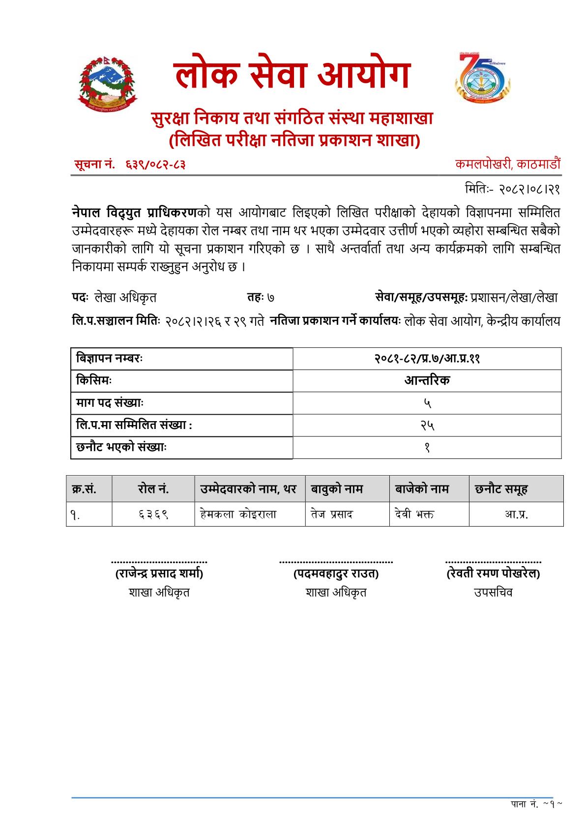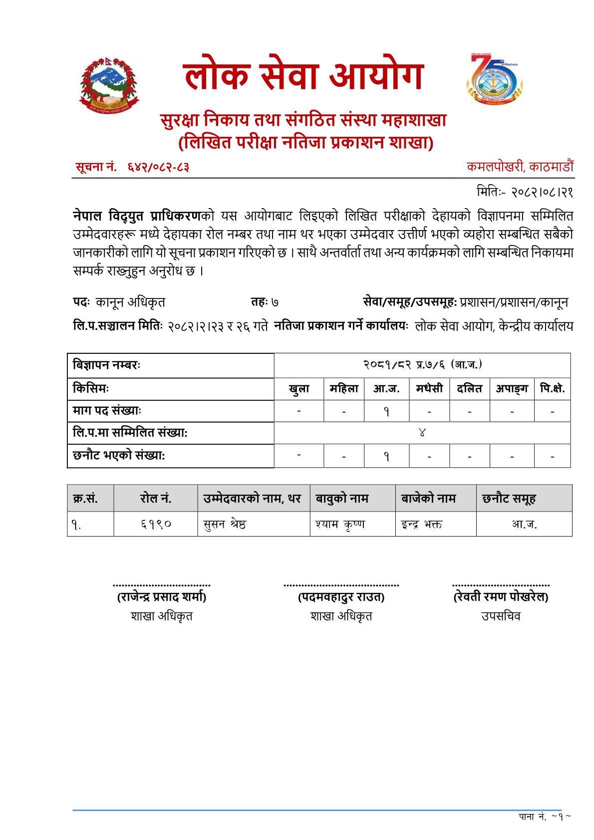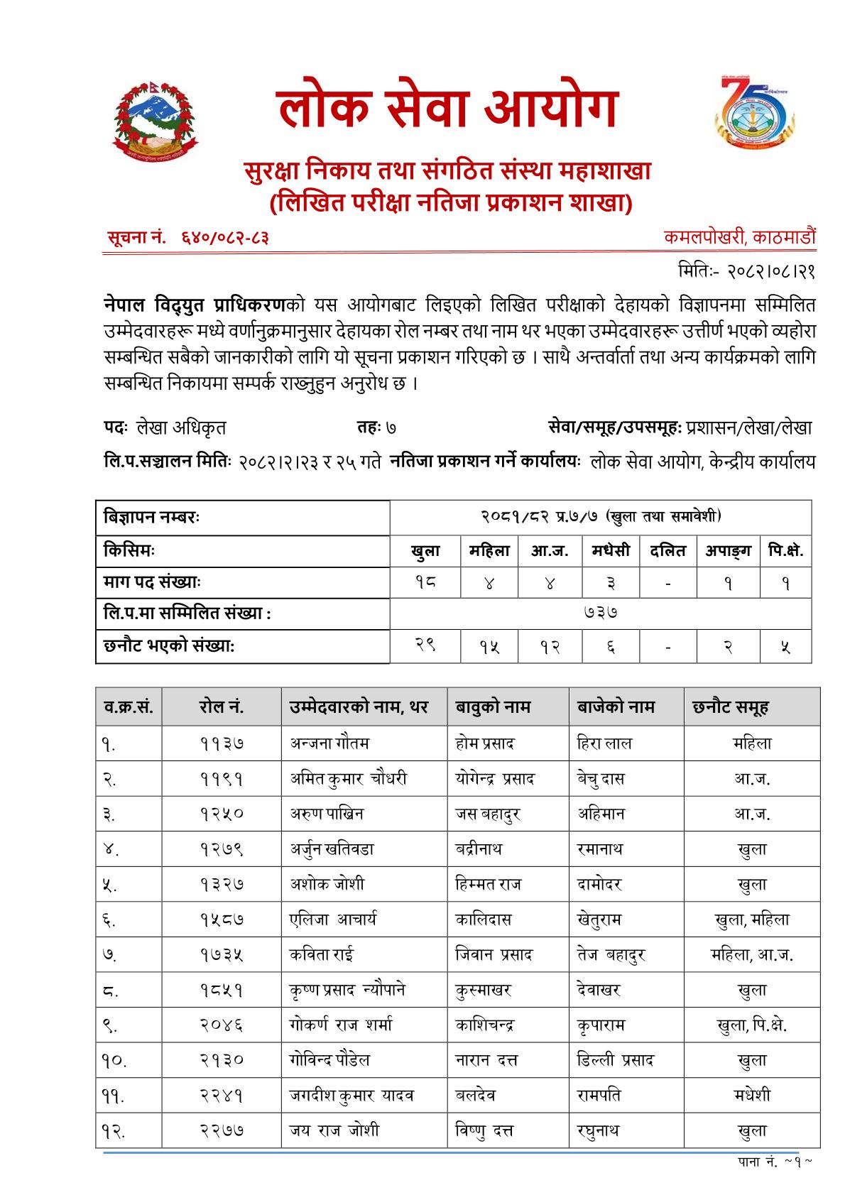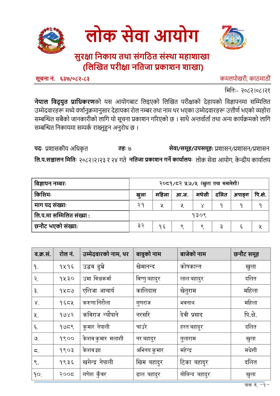 लोक सेवा आयोगले नेपाल विद्युत प्राधिकरणअन्तर्गत प्रशासन सेवा तथा खुला–समावेशी तर्फका विभिन्न विज्ञापन नम्बर, समूह/उपसमूह तथा पदका तह ७ का लिखित परीक्षाको नतिजा सार्वजनिक गरेको छ ।