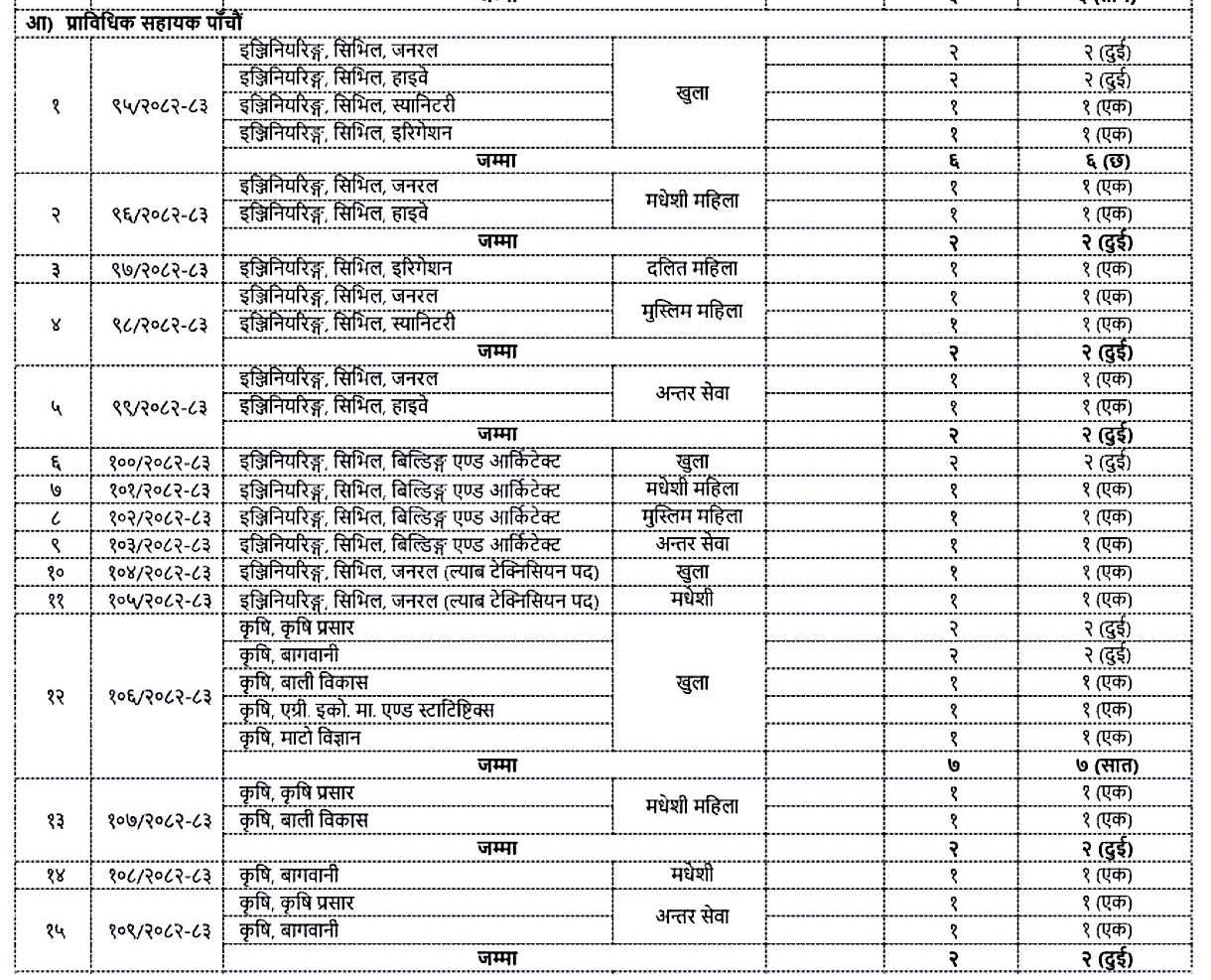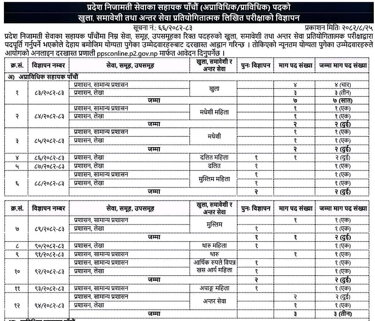 प्रदेश सरकारको प्रदेश निजामती सेवा आयोगले सहायक पाँचौँ तह (अप्राविधिक/प्राविधिक) पदमा खुला, समावेशी तथा अन्तर सेवा प्रतियोगितात्मक लिखित परीक्षाका लागि नयाँ विज्ञापन प्रकाशित गरेको छ । विज्ञापन नं. ६६/०८०–८१ अनुसार प्रशासन तथा लेखाबाट विभिन्न समावेशी वर्गका गरी जम्मा २३ पदका लागि दरखास्त आह्वान गरिएको छ ।