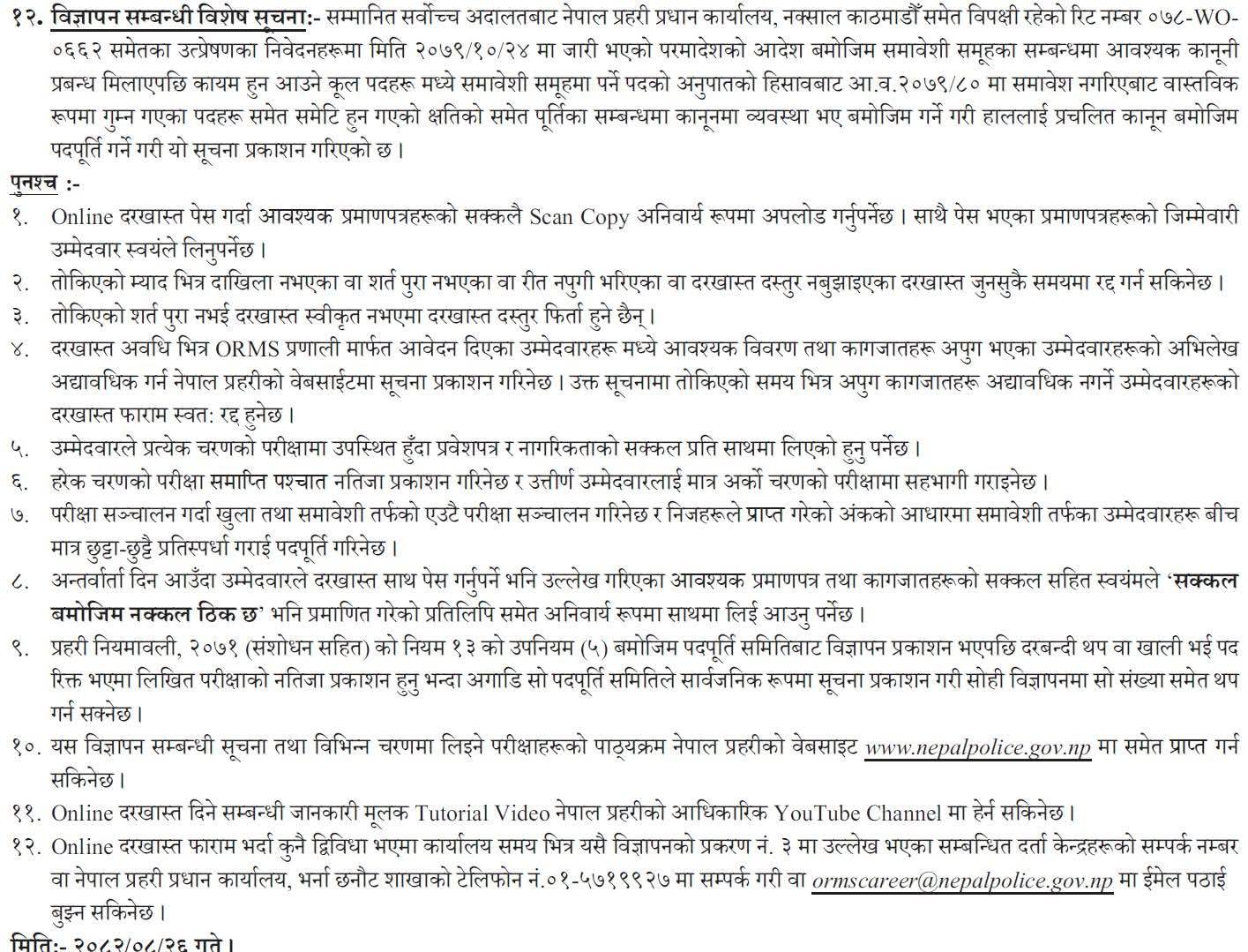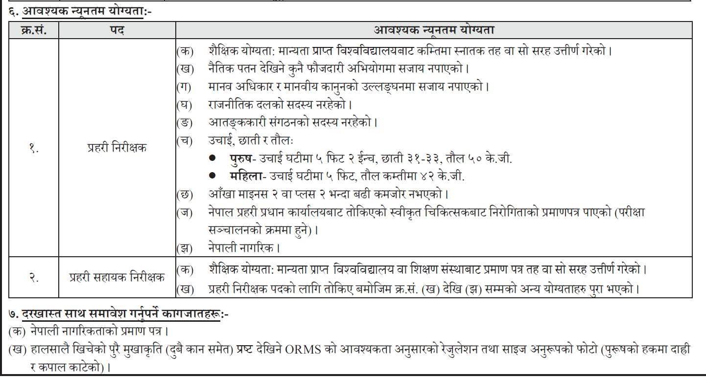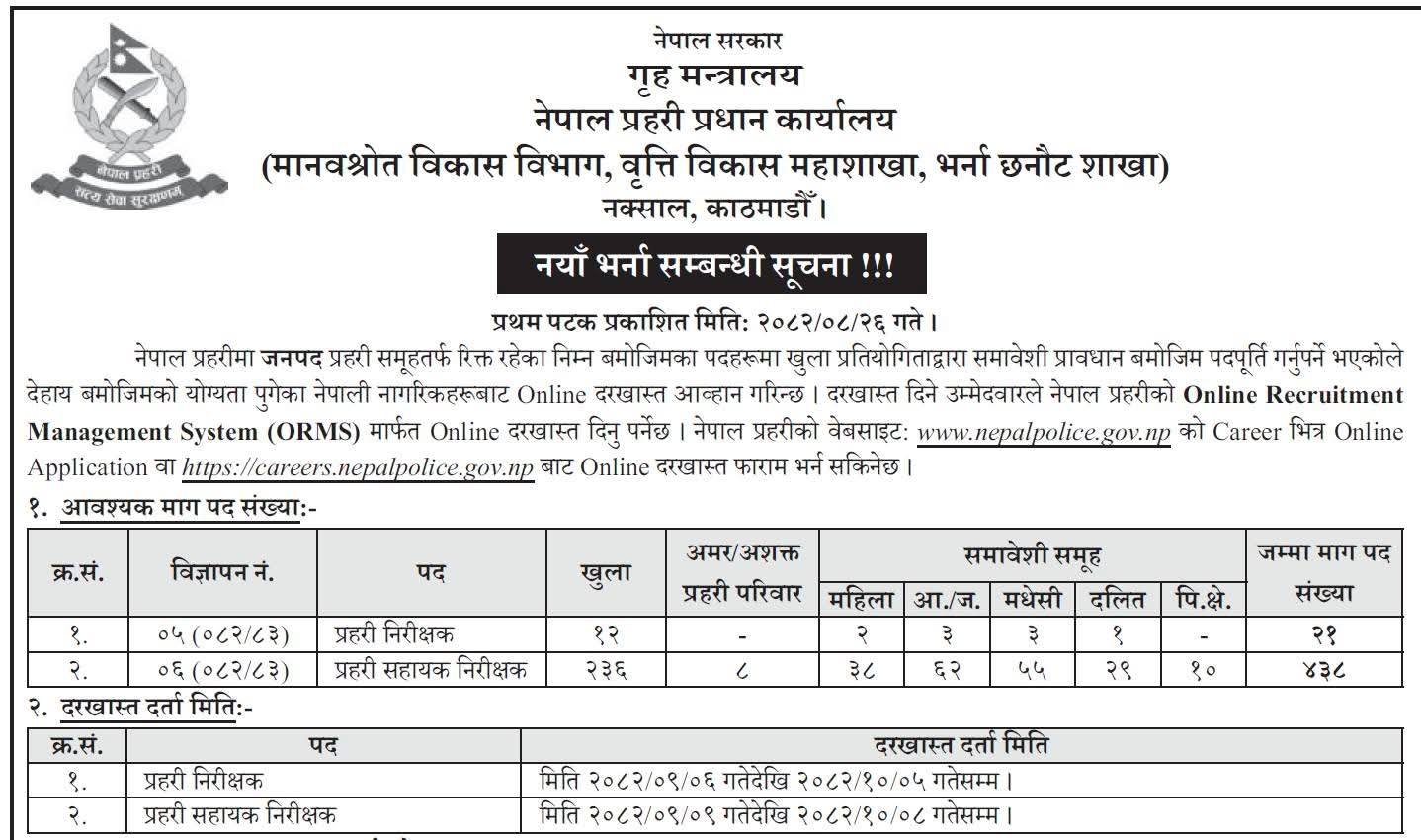 सूचना अनुसार प्रहरी निरीक्षक २२ पद र प्रहरी सहायक निरीक्षक ४३८ पदका लागि भर्ना प्रक्रिया सुरु गरिएको छ। इच्छुक उम्मेदवारहरूले नेपाल प्रहरीको आधिकारिक वेबसाइटमार्फत अनलाइन आवेदन दिन सक्नेछन् ।