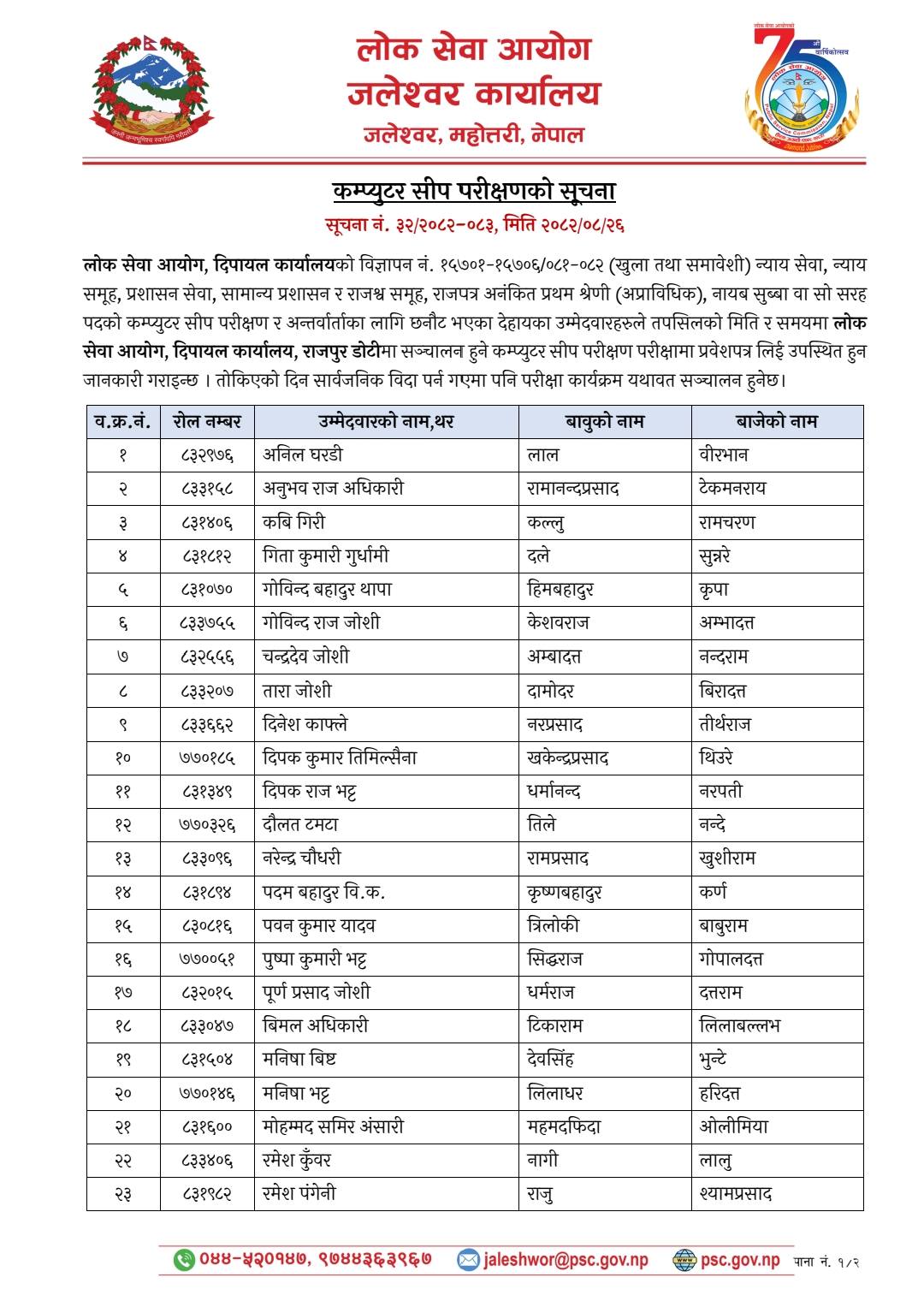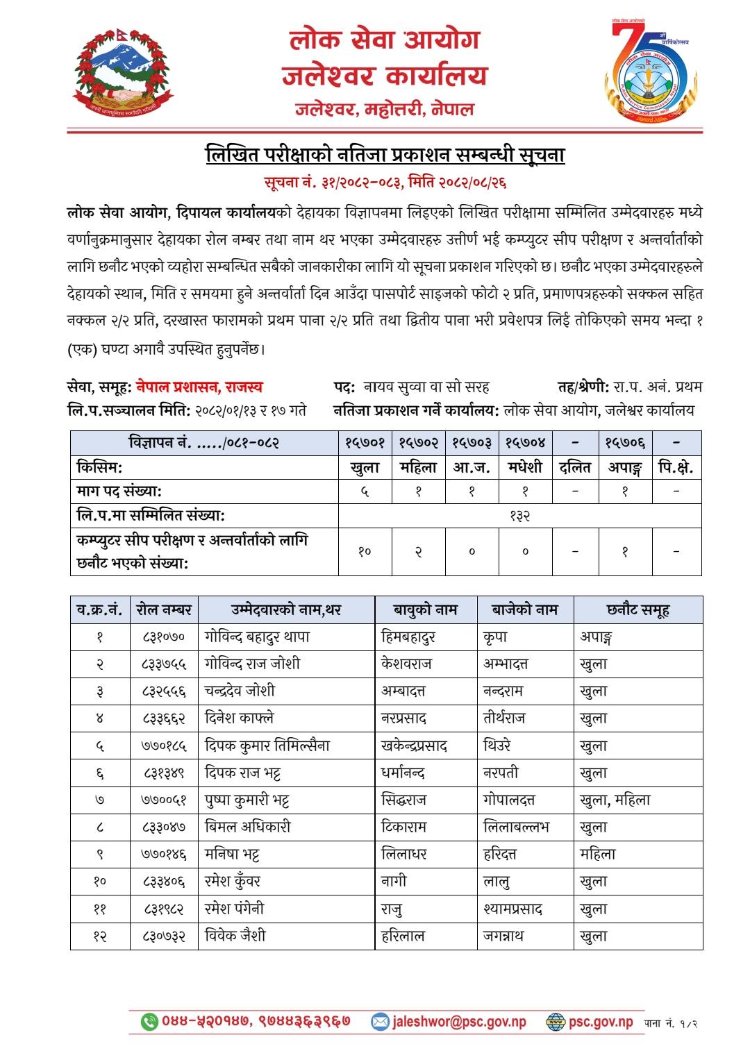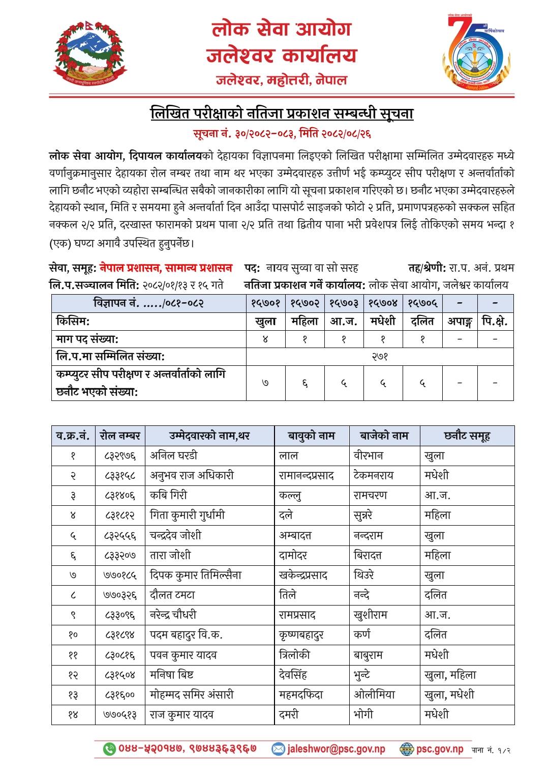 लोक सेवा आयोग, जलेश्वर कार्यालयले नायब सुब्बा (नासु) सरह पदको लिखित परीक्षाको नतिजा सार्वजनिक गरेको छ । प्रकाशित नतिजाअनुसार सफल उम्मेदवारहरू कम्प्युटर सीप परीक्षा र अन्तर्वार्ताका लागि छनोट भएका छन् ।