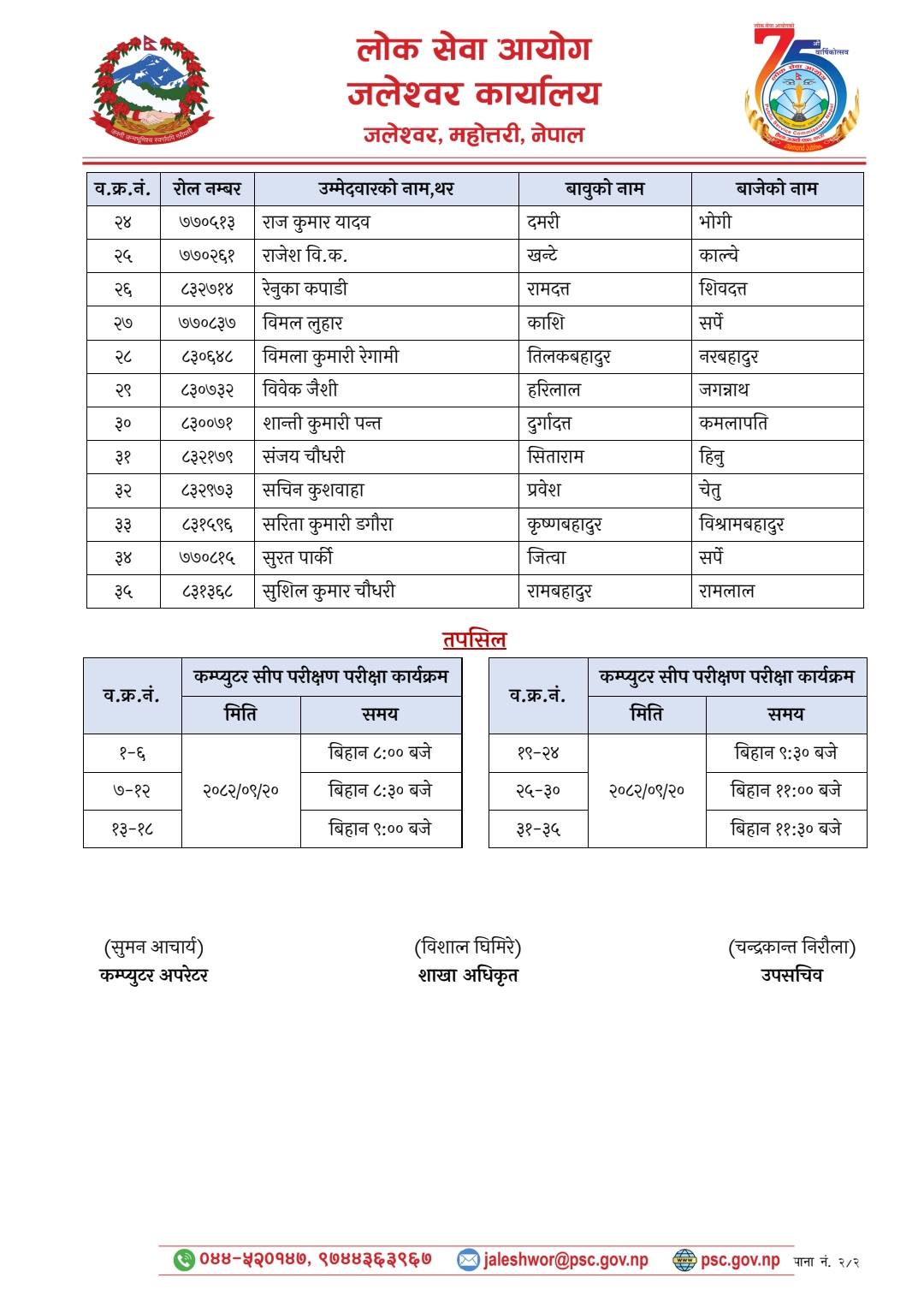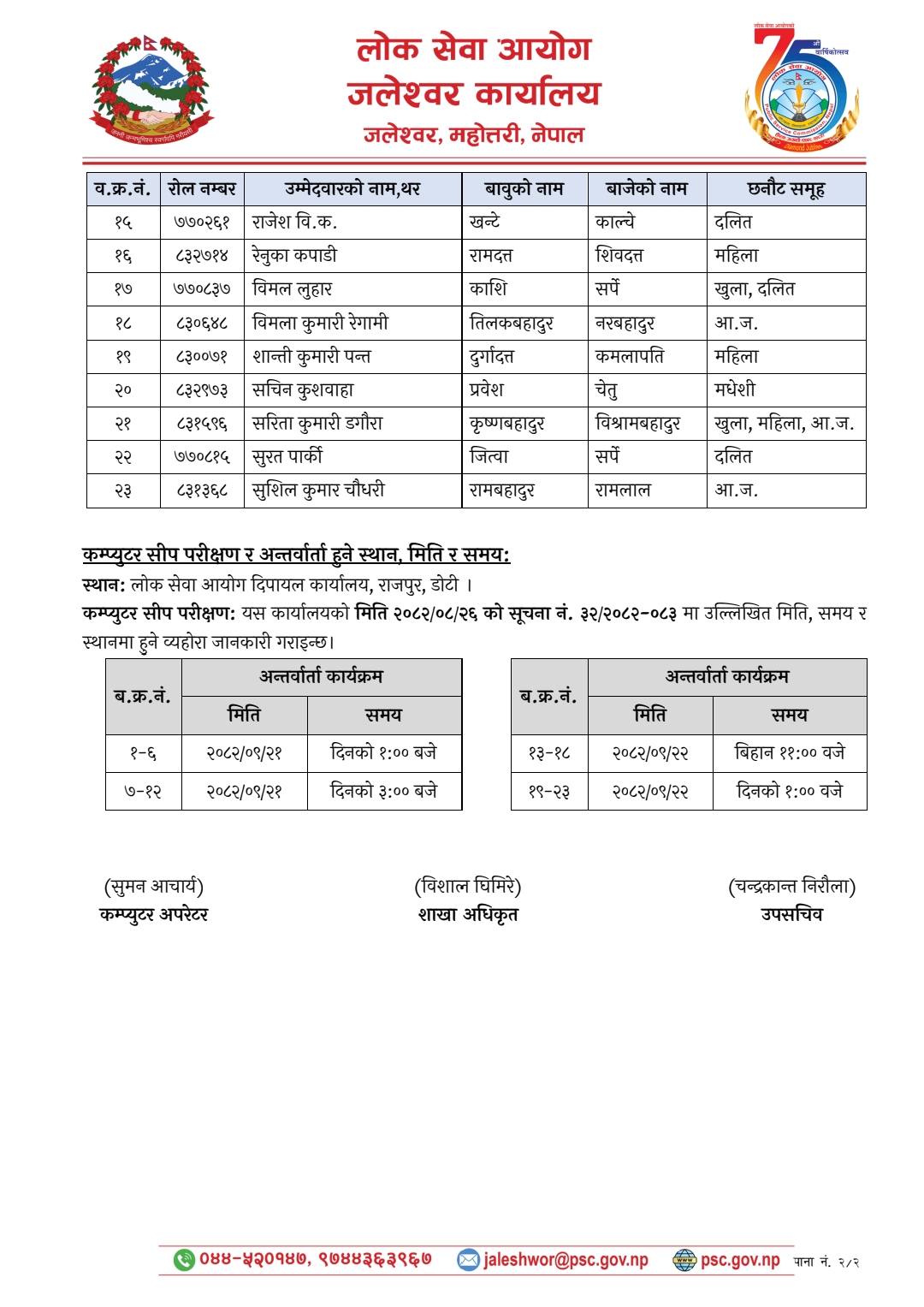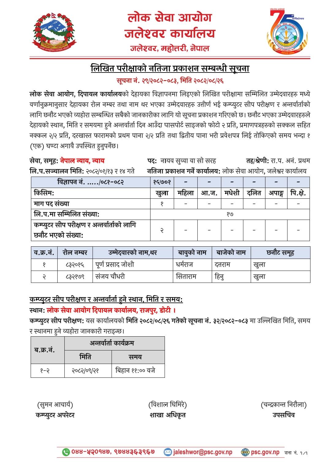 लोक सेवा आयोग, जलेश्वर कार्यालयले नायब सुब्बा (नासु) सरह पदको लिखित परीक्षाको नतिजा सार्वजनिक गरेको छ । प्रकाशित नतिजाअनुसार सफल उम्मेदवारहरू कम्प्युटर सीप परीक्षा र अन्तर्वार्ताका लागि छनोट भएका छन् ।