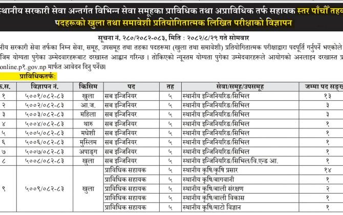 सूचना अनुसार स्थानीय इन्जिनियरिङ (सिभिल) सेवा अन्तर्गत सब इन्जिनियर पदका लागि खुला, महिला, आदिवासी जनजाति, मधेसी, मुस्लिम, थारु र अपाङ्गता भएका उम्मेदवारका लागि छुट्टाछुट्टै कोटामा पद संख्या तोकिएको छ। साथै स्थानीय इन्जिनियरिङ/सिभिल/भि.एण्ड.ए. सेवामा पनि सब इन्जिनियर पद माग गरिएको छ।