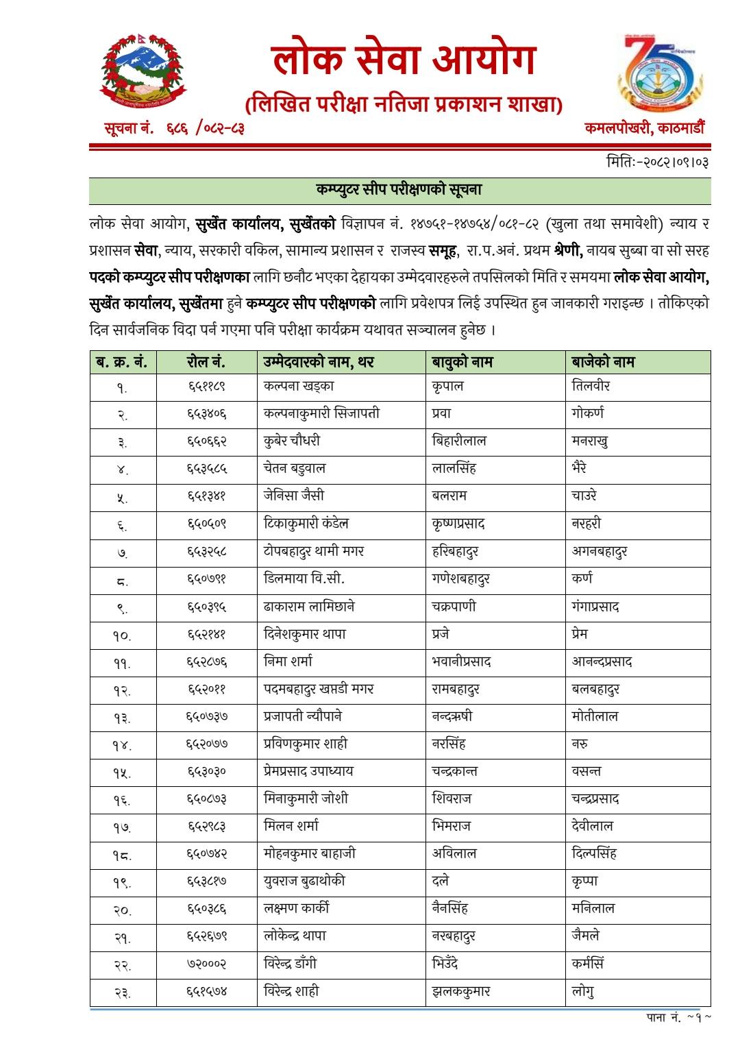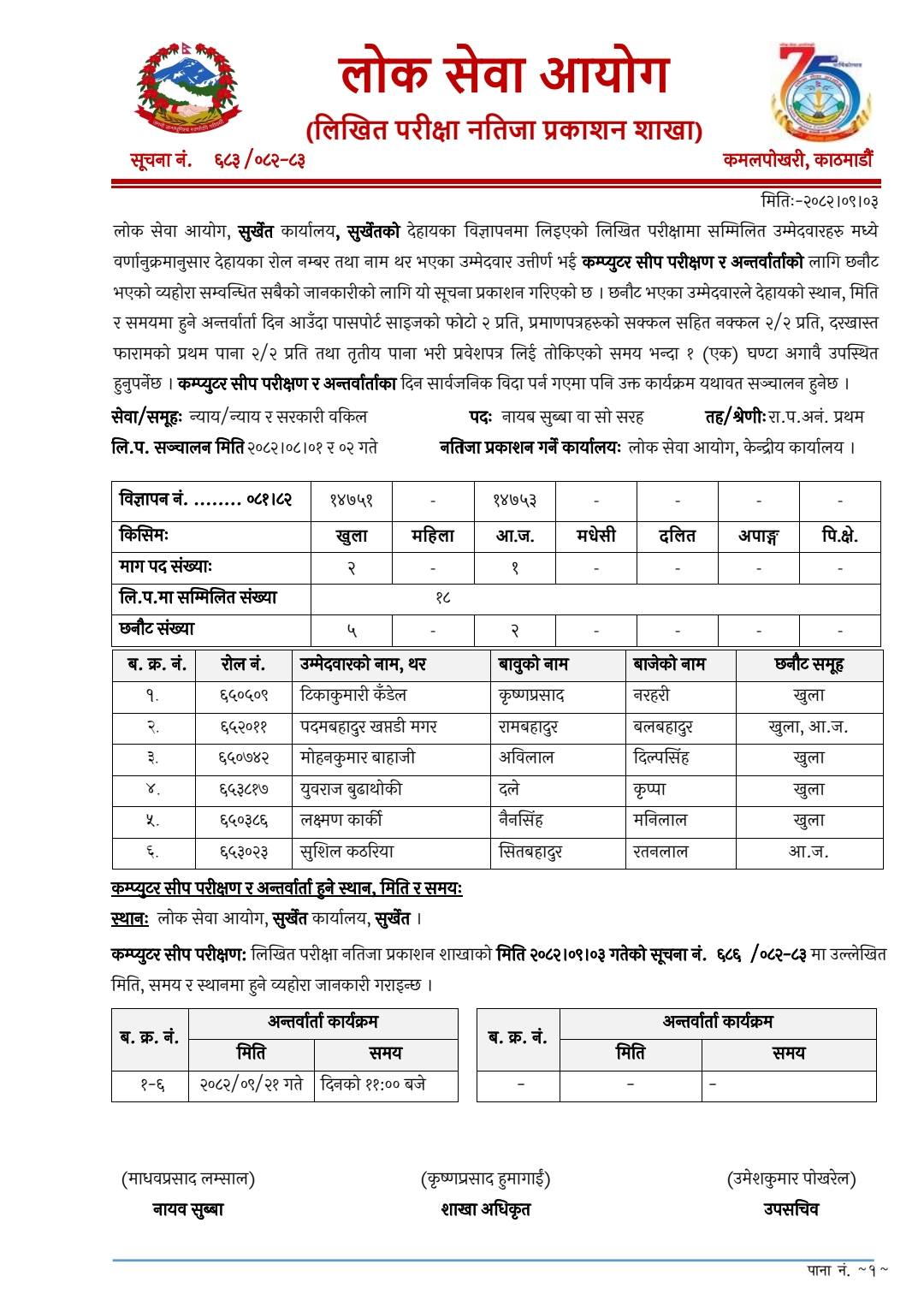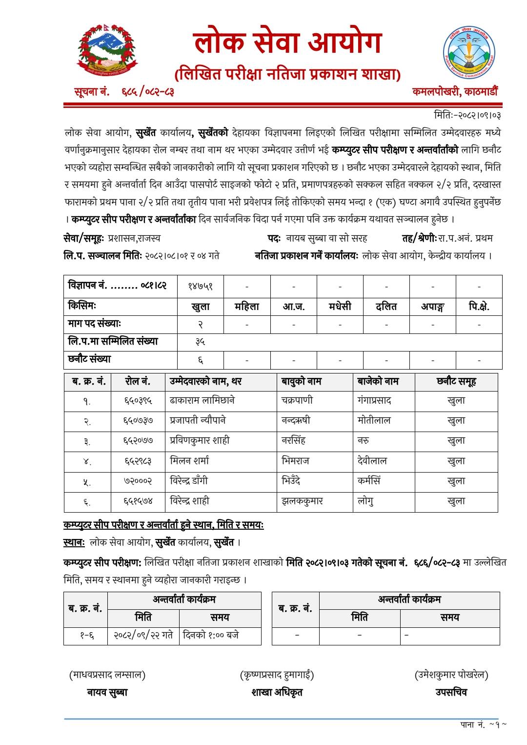 छनोट भएका उम्मेदवारहरूलाई आगामी २०८२ वैशाख २२ गते दिउँसो २ बजे लोक सेवा आयोग, सुर्खेत कार्यालयमा कम्प्युटर सीप परीक्षण तथा अन्तर्वार्ताका लागि उपस्थित हुन आयोगले सूचित गरेको छ ।