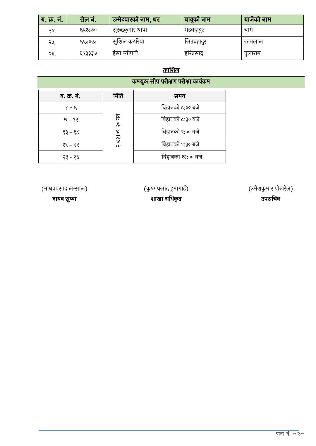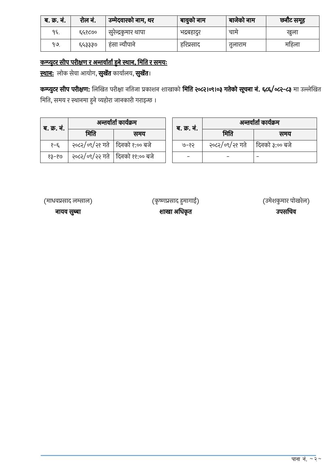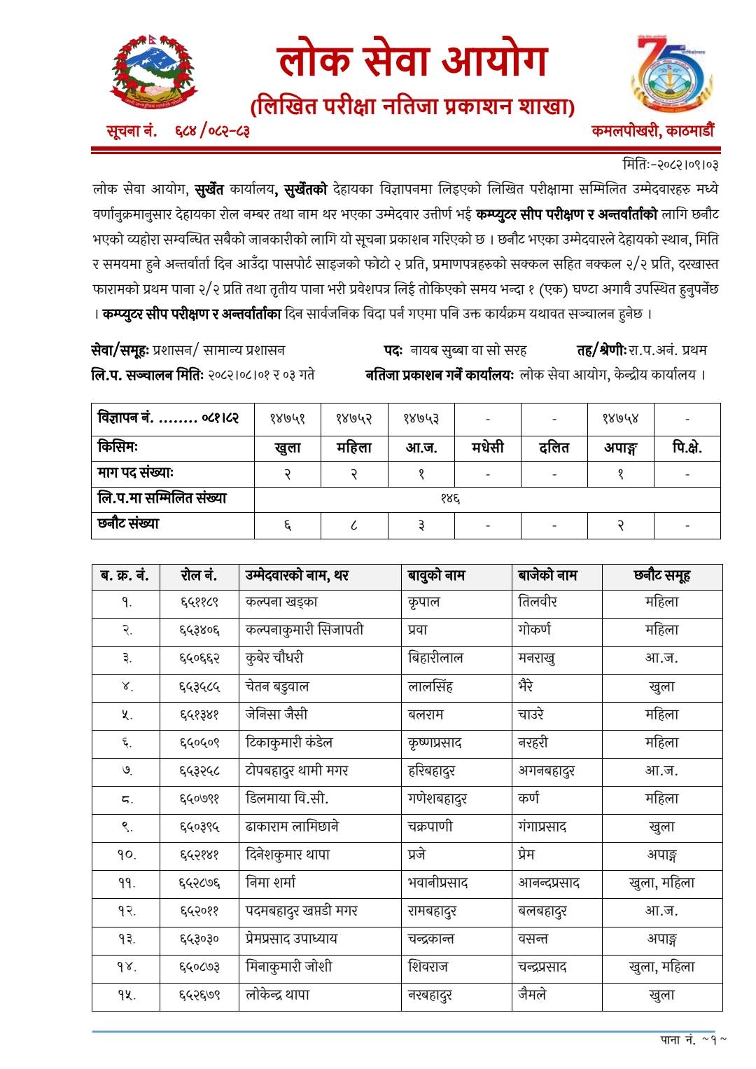 छनोट भएका उम्मेदवारहरूलाई आगामी २०८२ वैशाख २२ गते दिउँसो २ बजे लोक सेवा आयोग, सुर्खेत कार्यालयमा कम्प्युटर सीप परीक्षण तथा अन्तर्वार्ताका लागि उपस्थित हुन आयोगले सूचित गरेको छ ।