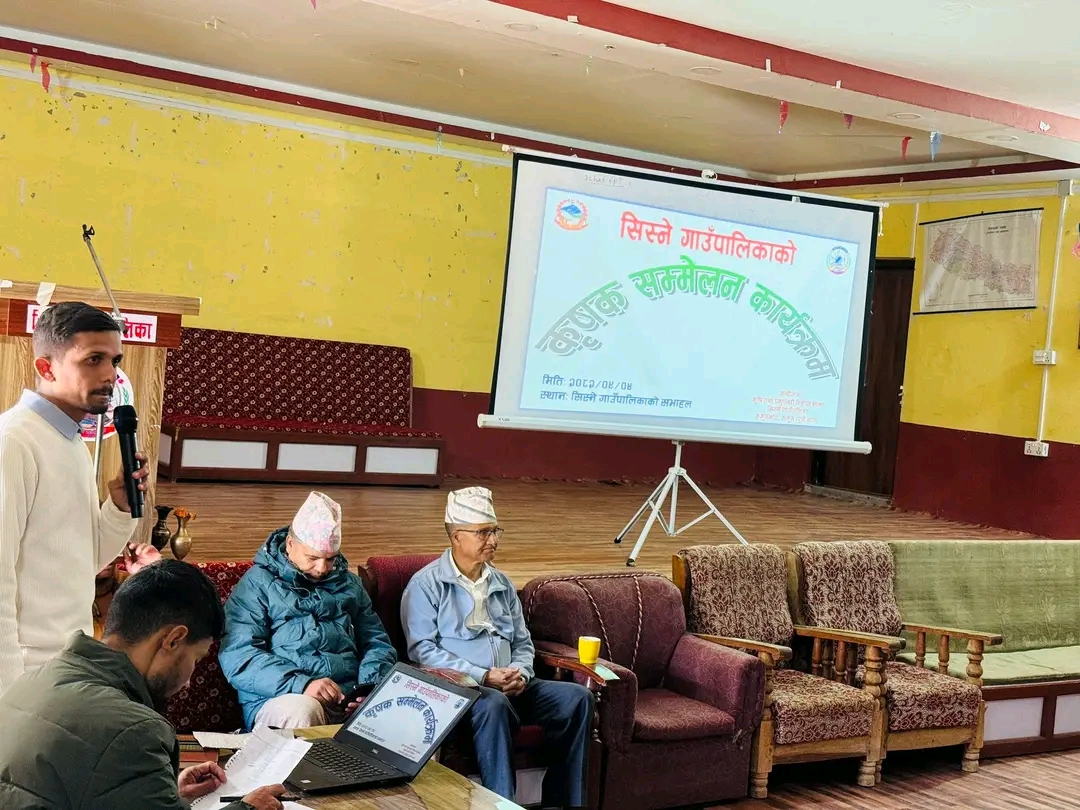 रुकुमको सिस्ने गाउँपालिकाको आयोजनामा गाउँपालिका भित्रका अगुवा कृषकहरूका लागि कृषि सम्मेलन कार्यक्रम सम्पन्न भएको छ । निरन्तर कृषि क्षेत्रमा सक्रिय कृषकहरूलाई व्यावसायिक रूपमा अघि बढाउने तथा कृषकले उत्पादन गरेका वस्तुको बजारीकरण कसरी गर्ने भन्ने उद्देश्यका साथ कार्यक्रम सञ्चालन गरिएको हो ।