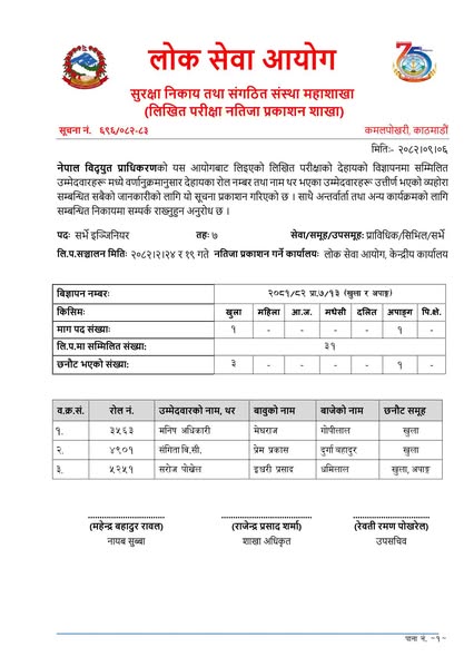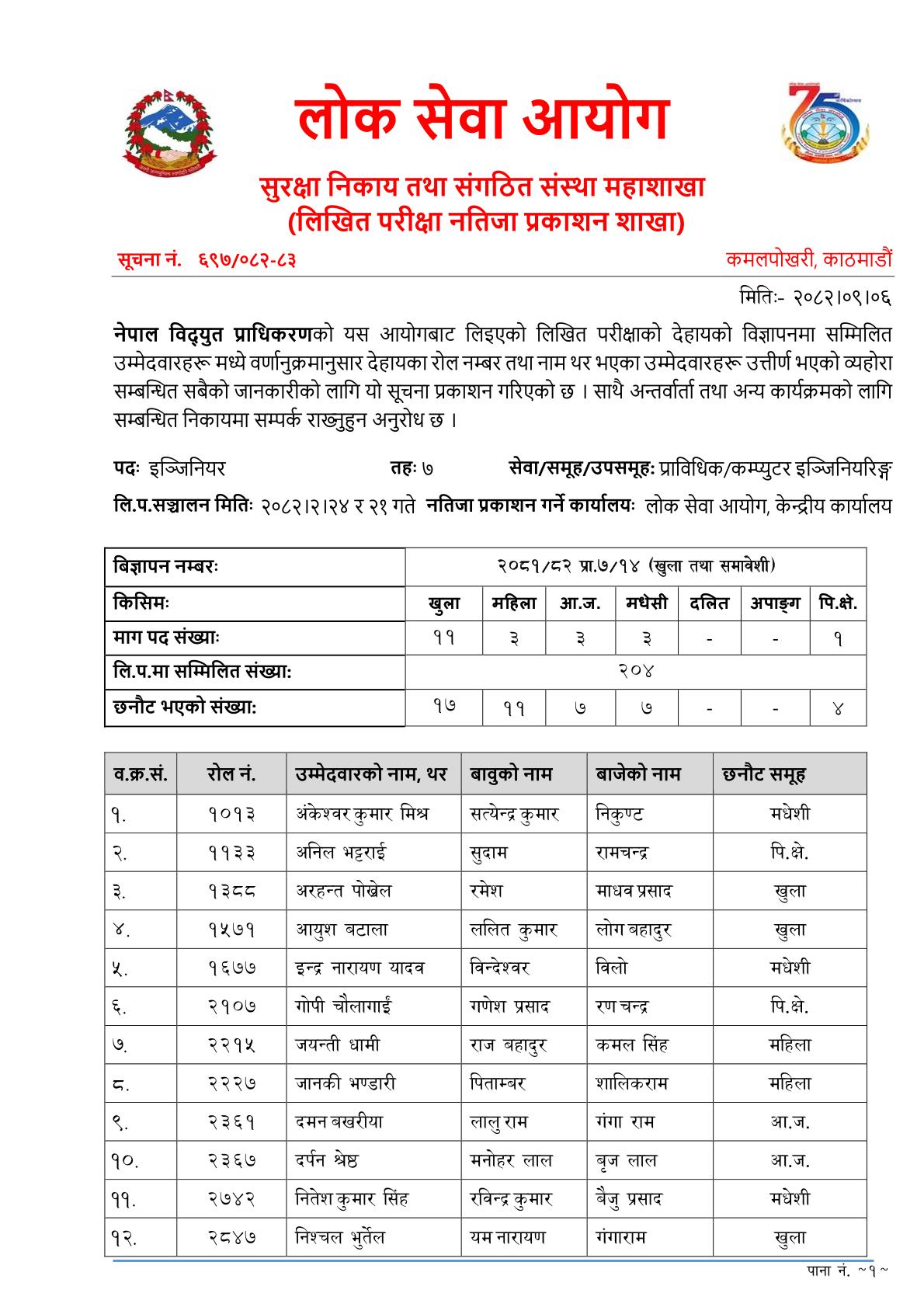 नेपाल विद्युत प्राधिकरणको प्राविधिक सेवाअन्तर्गत खुला तथा समावेशी तर्फका विभिन्न विज्ञापन नम्बर, समूह/उपसमूह र पदका तह–७ का लागि लिइएको लिखित परीक्षाको नतिजा सार्वजनिक गरिएको छ ।