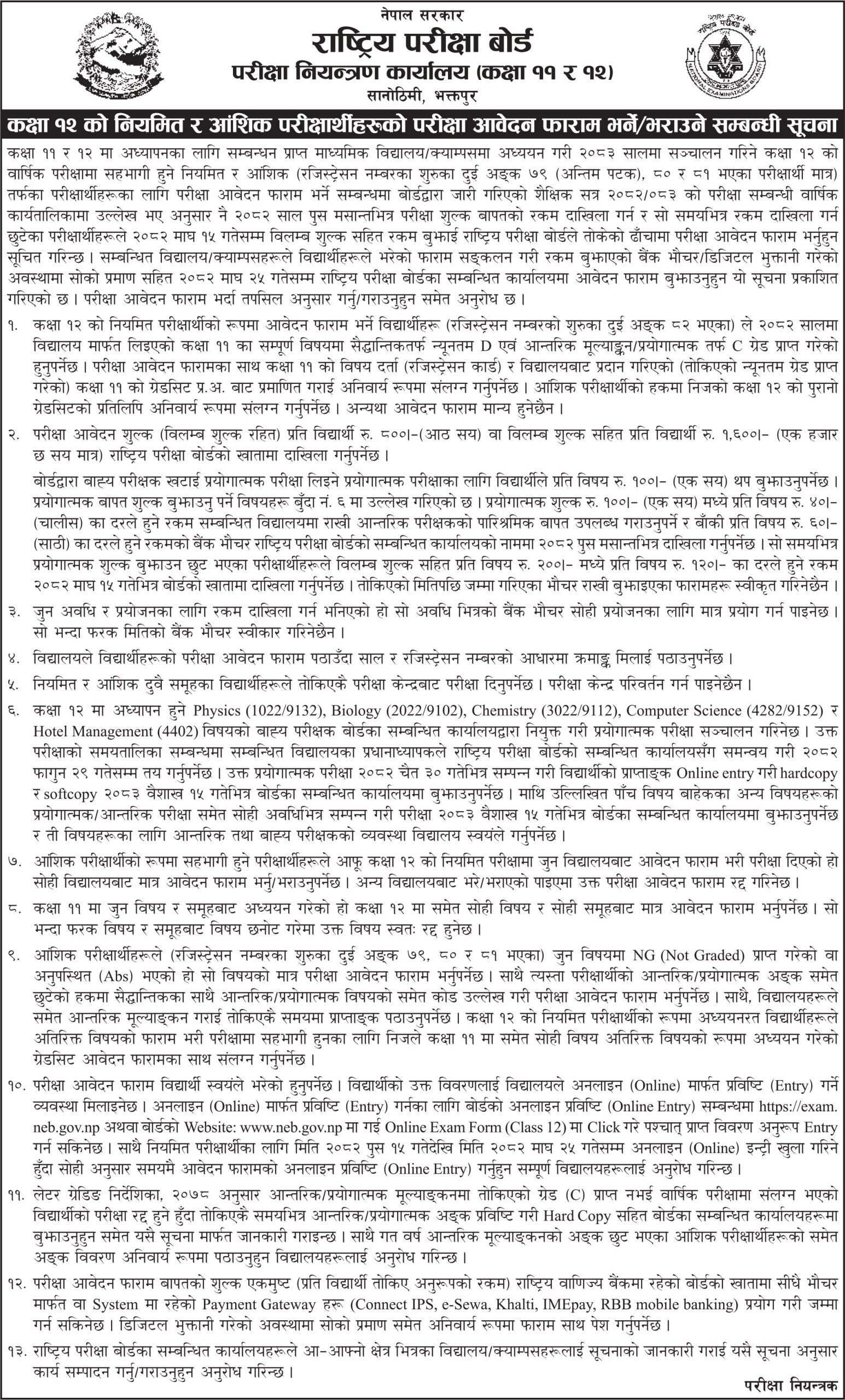 नियमित परीक्षार्थी हुन कक्षा ११ को सैद्धान्तिकतर्फ न्यूनतम ‘डी’ ग्रेड र आन्तरिक वा प्रयोगात्मकतर्फ ‘सी’ ग्रेड प्राप्त गरेको हुनुपर्ने अनिवार्य सर्त राखिएको छ । आवेदन फारामसँगै विद्यालयबाट प्रमाणित कक्षा ११ को ग्रेडसिट र रजिस्ट्रेसन कार्डको प्रतिलिपि बुझाउनुपर्नेछ ।