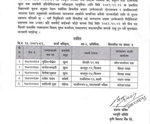 बैंकको कर्मचारी व्यवस्थापन विभाग, मुख्य कार्यालय काठमाडौँका अनुसार खुला तथा समावेशी प्रतिस्पर्धात्मक परीक्षाअन्तर्गत सहायक र अधिकृत तहका विभिन्न पदमा सफल उम्मेदवारहरूको नाम सार्वजनिक गरिएको हो ।