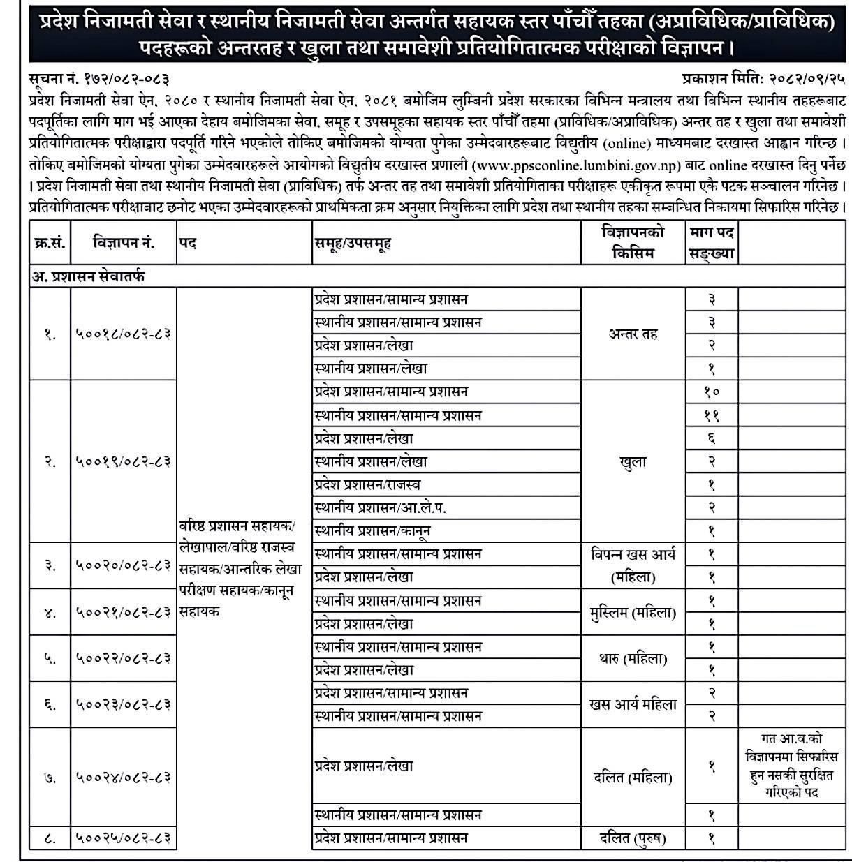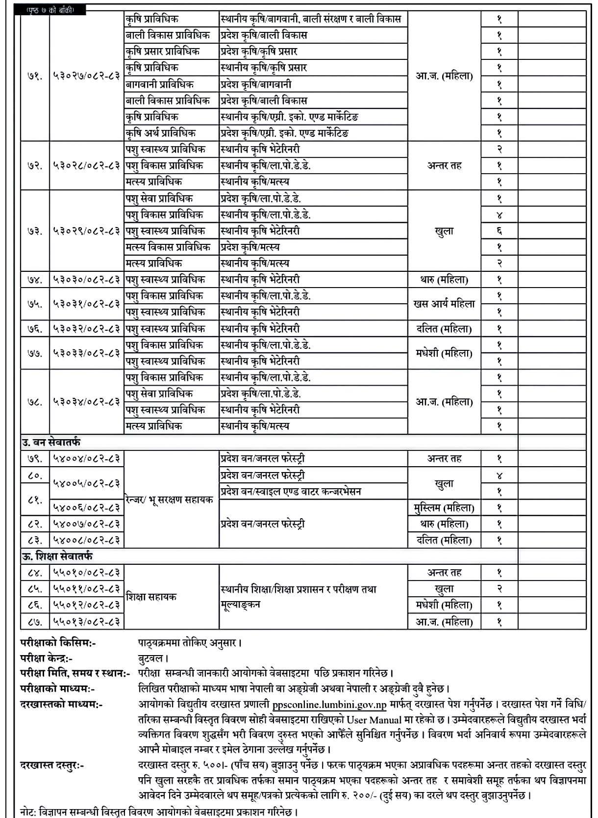 लुम्बिनी प्रदेश लोक सेवा आयोगले प्रदेश निजामती सेवा र स्थानीय निजामती सेवाअन्तर्गत सहायकस्तर पाँचौँ तहका विभिन्न पदमा कर्मचारी पदपूर्तिका लागि दरखास्त आह्वान गरेको छ । आयोगले अन्तर तह, खुला तथा समावेशी प्रतिस्पर्धात्मक परीक्षामार्फत पदपूर्ति गर्न विज्ञापन प्रकाशित गरेको हो ।