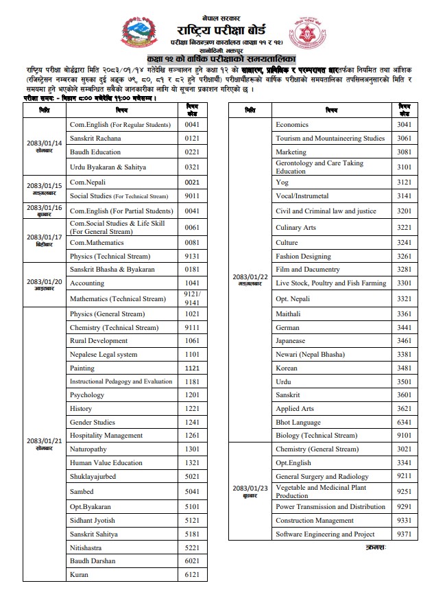 कक्षा १२ को परीक्षा आगामी वैशाख १४ गतेबाट सुरु हुने भएको छ ।