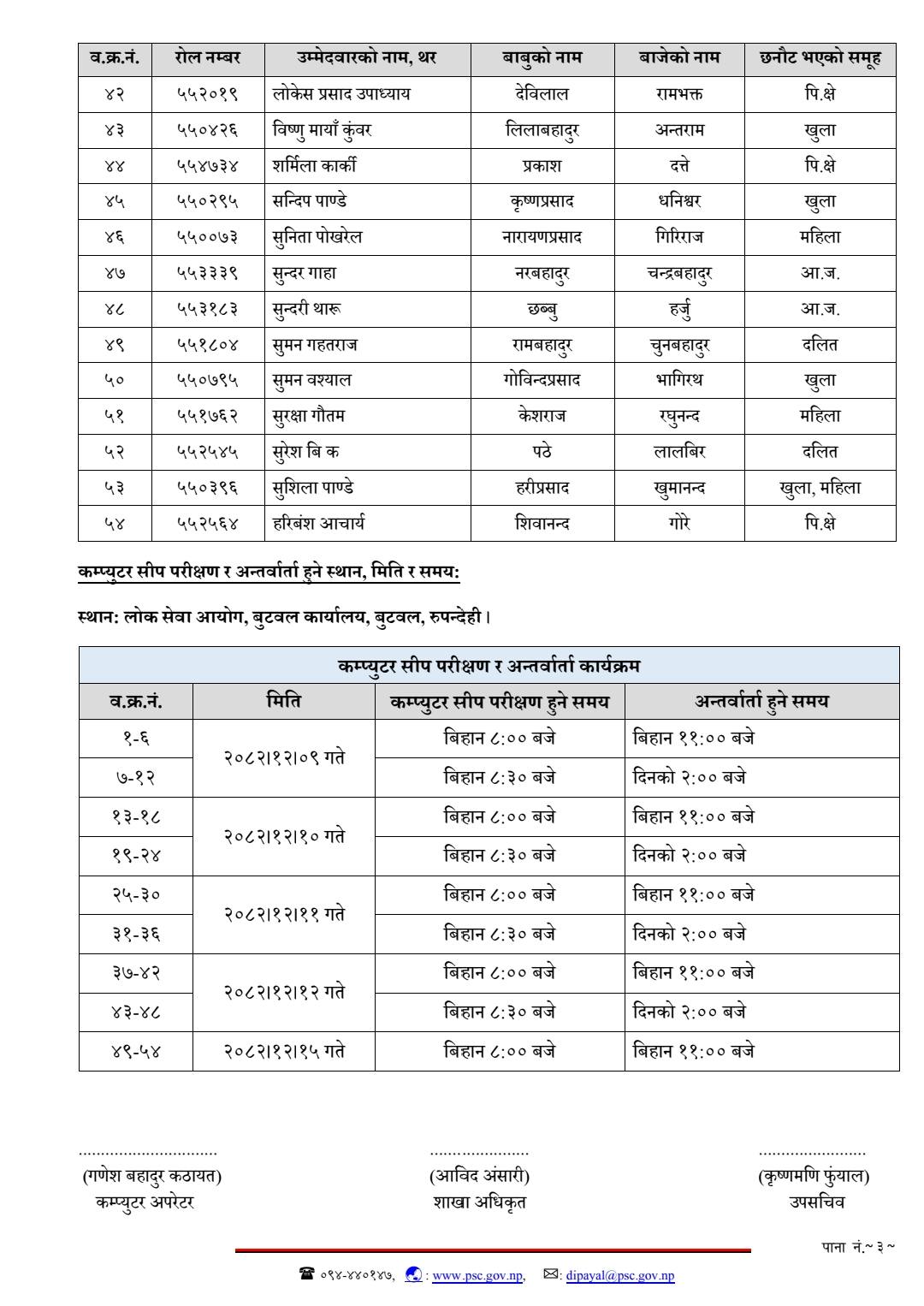छनोट भएका उम्मेदवारले आवश्यक कागजातसहित तोकिएको मिति, समय र स्थानमा उपस्थित हुन आयोगले सूचना दिएको छ । कम्प्युटर सीप परीक्षण र अन्तर्वार्ता सम्बन्धी विस्तृत विवरण आयोगको दिपायल कार्यालयमा उपलब्ध रहेको जनाइएको छ ।
