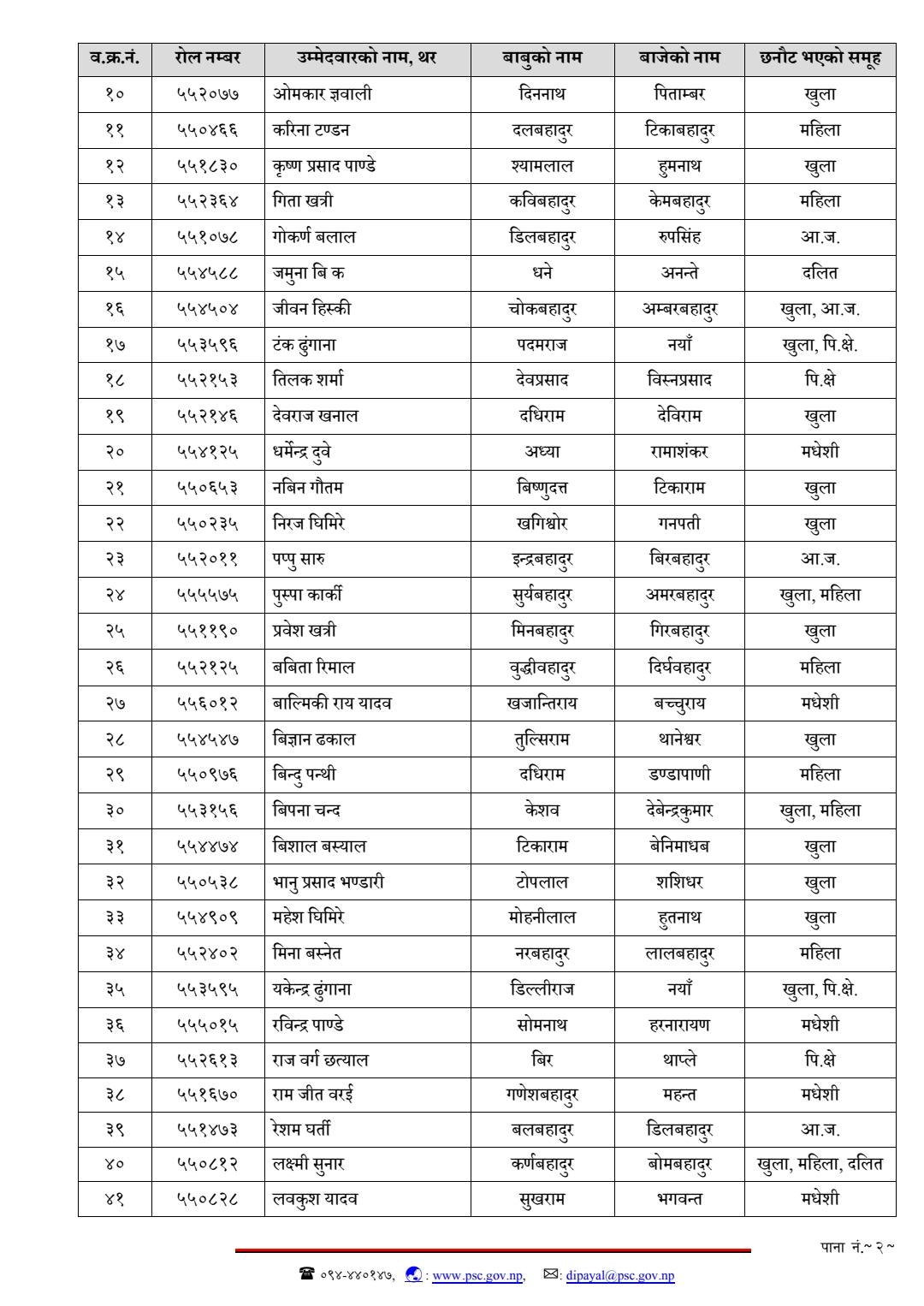 लोक सेवा आयोग, दिपायल कार्यालय (परीक्षा शाखा) ले खरिदार वा सो सरह पदको लिखित परीक्षाको नतिजा सार्वजनिक गरेको छ । आयोगका अनुसार विज्ञापन नं. ०८२/८३ अन्तर्गत खुला तथा समावेशी समूहका विभिन्न कोटाबाट लिइएको परीक्षामा सहभागीमध्ये तोकिएका उम्मेदवारहरू कम्प्युटर सीप परीक्षण र अन्तर्वार्ताका लागि छनोट भएका छन् ।