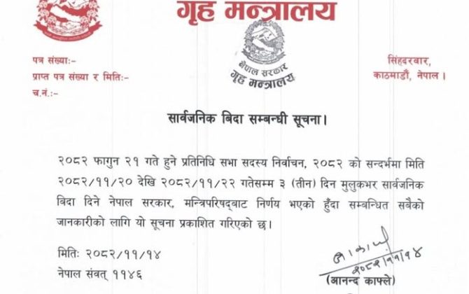 फागुन २१ गते हुने प्रतिनिधि सभा सदस्य निर्वाचनका सन्दर्भमा नेपाल सरकारले तीन दिन सार्वजनिक बिदा दिने निर्णय गरेको छ । गृह मन्त्रालयद्वारा जारी सूचनाअनुसार फागुन २०, २१ र २२ गते (तीन दिन) मुलुकभर सार्वजनिक बिदा रहनेछ ।