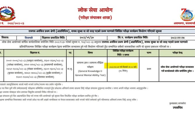 राजपत्र अनङ्कित प्रथम श्रेणी (अप्राविधिक) को प्रथम चरण लिखित परीक्षा मिति तोकियो