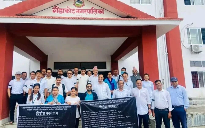 गैंडाकोट नगरपालिकाका कर्मचारीहरुले हातमा कालोपट्टी बाधेर आन्दोलनको केन्द्रिय कार्यक्रममा एक्यवद्धता जनाएका छन । कालो ब्यानर सहित बिरोध कार्यक्रममा उत्रिएका कर्मचारीहरुले एकीकृत निजामती सेवा ऎनको माग गरेका छन । देशभरका विभिन्न पालिकाका जस्तै गैंडाकोट नगरपालिकामा पनि कर्मचारी आन्दोलित बनेका हुन । विगत लामो समयदेखि निजामती सेवा ऐनको अभावको कारणले गर्दा वृद्धि विकास र आफ्ना विभिन्न आधारभुत अधिकार बाट समेत वञ्चित भएका स्थानीय तहका कर्मचारीहरु आफ्नो अधिकार प्राप्तीका लागि संगठित र एकिकृत हुन थालेका छन । कर्मचारी समायोजन ऐन अनुशार स्थानीय तहका समायोजन भएका कर्मचारीहरु लोक सेवा आयोग बाट र प्रदेश लोक सेवा आयोग बाट स्थानीय तहका सिफारिस भएका कर्मचारीहरु आफ्नो अधिकार प्राप्तीका लागि संगठित भएर आन्दोलनमा उत्रिएका छन । साविकका स्थानीय निकाय र जिल्ला विकास समिती तर्फबाट स्थानीय तहमा समायोजन भएका कर्मचारीहरु पनि आन्दोलनको अग्रमोर्चामा रहेका छन । निजामती सेवा ऐन भनेर संघीय सरकार अन्तर्गतका कर्मचारीहरुलाइ मात्रै समेटेर ल्याउन खोजिएको निजामती सेवा ऐनले स्थानीय तहमा कार्यरत कर्मचारीलाई समेट्न नसकेको भन्दै स्थानीय तहका कर्मचारीहरुले असन्तुष्टि जनाउदै आएका छन ।